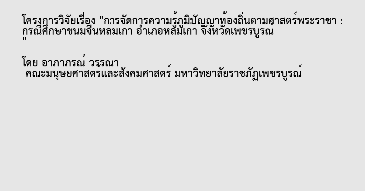 3. การเผยแพร่องค์ความรู้ภูมิปัญญาท้องถิ่นขนมจีนหล่มเก่า อำเภอหล่มเก่า จังหวัดเพชรบูรณ์ จัดทำเว็บเพจและเผยแพร่ผ่านทางโซเชียลเน็ตเวิร์ก พร้อมกับศึกษาแนวทางการอนุรักษ์ภูมิปัญญาท้องถิ่นขนมจีนหล่มเก่า ให้เป็นมรดกของชุมชน และผู้วิจัยได้จัดอบรมเชิงถ่ายทอดเทคโนโลยีปฏิบัติการ “การจัดการความรู้ภูมิปัญญาท้องถิ่น ตามศาสตร์พระราชา : กรณีศึกษาขนมจีนหล่มเก่า อำเภอหล่มเก่า จังหวัดเพชรบูรณ์” ได้แก่ นักศึกษาและผู้สนใจ ณ ห้องประชุมคณะมนุษยศาสตร์และสังคมศาสตร์ มหาวิทยาลัยราชภัฏเพชรบูรณ์ ผู้เข้าร่วมอบรม จำนวน 30 คน ใช้เวลา 1 วัน ในระบบออนไลน์