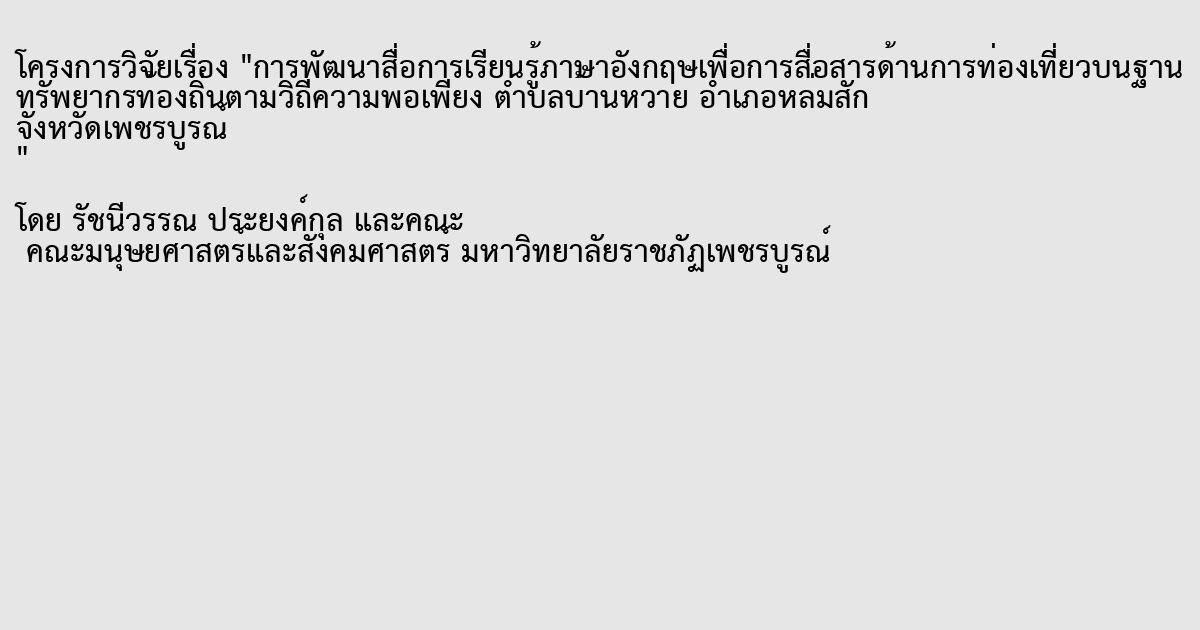 การพัฒนาสื่อการเรียนรู้ภาษาอังกฤษเพื่อการสื่อสารด้านการท่องเที่ยวบนฐานทรัพยากรท้องถิ่นตามวิถีความพอเพียง ตำบลบ้านหวาย อำเภอหล่มสัก จังหวัดเพชรบูรณ์