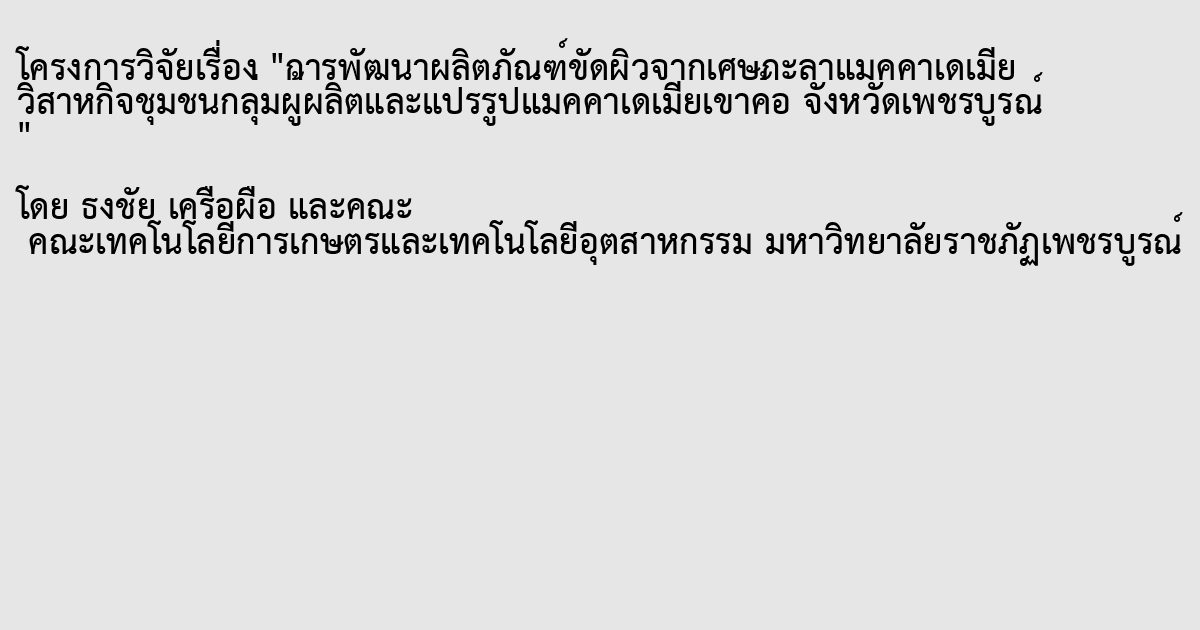 งานวิจัยนี้มุ่งทำการพัฒนาผลิตภัณฑ์ขัดผิวจากเศษกะลาแมคคาเดเมีย วิสาหกิจชุมชนกลุ่มผู้ผลิตและแปรรูปแมคคาเดเมียเขาค้อ จังหวัดเพชรบูรณ์โดยมีวัตถุประสงค์เพื่อจัดทำผลิตภัณฑ์ขัดผิวสำหรับทำความสะอาดคราบน้ำมัน คราบสี และสิ่งสกปรกทั่วไป และทำการทดสอบประสิทธิภาพการใช้งาน รวมไปถึงการถ่ายทอดองค์ความรู้ให้กับวิสาหกิจชุมชน ซึ่งจากการวิจัย พบว่า ความพึงพอใจในการออกแบบเครื่องเฉลี่ยอยู่ที่ 4.40±0.61 มีค่าคะแนนอยู่ในระดับมาก ผลการประเมินความพึงพอใจในการสร้างเครื่องค่าเฉลี่ยอยู่ที่ 4.38± 0.60 มีค่าคะแนนอยู่ในระดับมาก และผลการประเมินการถ่ายทอดองค์ความรู้มีค่าเฉลี่ยอยู่ที่ 4.22±0.64 มีค่าคะแนนอยู่ในระดับมาก อย่างไรก็ตาม จากผลการทดลองทำก้อนผลิตภัณฑ์ขัดผิวที่ขนาดความละเอียดของผง 0.185 มิลลิเมตร มีความสะอาดของผิวหนังหลังจากการใช้งานดีที่สุดในทุก ๆ ตัวแปรของส่วนผสมผงแมคคาเดเมียที่ 30, 40 และ 50 กรัม และที่ส่วนผสม ผงแมคคาเดเมีย 40 กรัม มีค่าความสะอาดมากที่สุดอยู่ที่ 21 เปอร์เซ็นต์ และผลเชิงกายภาพจากขนาดของผงแมคคาเดเมียที่ 0.076 มิลลิเมตร มีลักษณะของก้อนที่มันวาวและผิวเรียบ ขนาดของผงแมคคาเดเมียที่ 0.185 มิลลิเมตร ลักษณะของก้อนขัดผิวมีความเงาด้านและบริเวณผิวมีลักษณะขรุขระเล็กน้อย และขนาดของผงแมคคาเดเมียที่ 0.336 มิลลิเมตร ลักษณะของก้อนขัดผิวเป็นแบบดำด้าน ไม่มีความเงาวาว และบริเวณผิวมีลักษณะขรุขระมาก