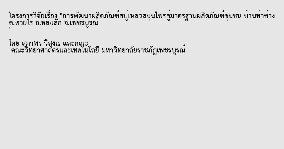 การพัฒนาผลิตภัณฑ์สบู่เหลวสมุนไพรสู่มาตรฐานผลิตภัณฑ์ชุมชนบ้านท่าช้าง ต.ห้วยไร่ อ.หล่มสัก จ.เพชรบูรณ์ มีวัตถุประสงค์เพื่อพัฒนาสูตร กรรมวิธีการผลิต และผลิตภัณฑ์ต้นแบบสบู่เหลวสมุนไพร ตรวจสอบคุณสมบัติของสบู่เหลวสมุนไพรตามมาตรฐานผลิตภัณฑ์ชุมชนและมาตรฐานอุตสาหกรรมเอส และถ่ายทอดองค์ความรู้และเทคโนโลยีสู่ชุมชน โดยใช้สมุนไพรที่มีอยู่ในท้องถิ่น คือ หมากและฝาง นามาสกัดสารสาคัญและพัฒนาเป็นผลิตภัณฑ์ต้นแบบสบู่เหลวสมุนไพร และถ่ายทอดความรู้สู่ชุมชน รูปแบบการวิจัย เป็นการวิจัยเชิงทดลอง ผลการวิจัยพบว่า การสกัดสารสาคัญจากหมากแห้งใช้วิธีการหมักด้วย Propylene glycol จะได้เป็นผงสีน้าตาลเข้มอมแดง ไม่มีกลิ่น การสกัดสารสาคัญฝาง ใช้วิธีการต้ม จะได้ลักษณะเป็นของเหลวใส สีส้ม ไม่มีกลิ่น การพัฒนาผลิตภัณฑ์สบู่เหลวสมุนไพรต้นแบบโดยใช้สารลดแรงตึงผิว (Surfactant) พัฒนาสูตรสบู่เหลวสมุนไพร จานวน 4 สูตร และนามาทดสอบคุณสมบัติทางกายภาพและเคมีของสบู่เหลวสมุนไพร มีค่าความเป็นกรด-ด่างเท่ากับ 5 การทดสอบด่างอิสระ ไม่พบด่างอิสระ มีค่าสารที่ไม่ละลายในเอทานอล ร้อยละ 0.20, 0.41, 1.33, 0.31 ตามลาดับ การวิเคราะห์ปริมาณไขมันทั้งหมด ร้อยละโดยมวล 3.32, 2.54, 1.29, 2.42 ตามลาดับ และนาองค์ความรู้และเทคโนโลยีไปถ่ายทอดสู่ชุมชน บ้านท่าช้าง ต.ห้วยไร่ อ.หล่มสัก จ.เพชรบูรณ์ เพื่อพัฒนาต่อยอดเป็นผลิตภัณฑ์ชุมชนต่อไป