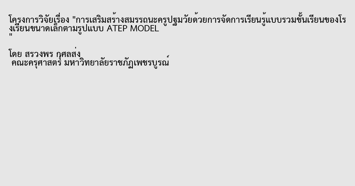 การวิจัยครั้งนี้มีวัตถุประสงค์ 1. เพื่อศึกษาข้อมูลพื้นฐาน และบริบทของสถานศึกษาระดับปฐมวัยสาหรับการพัฒนาการเสริมสร้างสมรรถนะครูปฐมวัยด้วยการจัดการเรียนรู้แบบรวมชั้นเรียนของโรงเรียนขนาดเล็กตามรูปแบบ ATEP MODEL 2. เพื่อสร้างและหาคุณภาพของรูปแบบ ATEP MODEL ที่เสริมสร้างสมรรถนะครูปฐมวัยด้วยการจัดการเรียนรู้แบบรวมชั้นเรียนของโรงเรียนขนาดเล็ก 3. เพื่อทดลองใช้และศึกษาผลการใช้รูปแบบ ATEP MODEL ที่เสริมสร้างสมรรถนะครูปฐมวัยด้วยการจัดการเรียนรู้แบบรวมชั้นเรียนของโรงเรียนขนาดเล็ก 4. เพื่อประเมินความพึงพอใจของครูปฐมวัยที่มีต่อการใช้รูปแบบ ATEP MODEL ที่เสริมสร้างสมรรถนะครูปฐมวัยด้วยการจัดการเรียนรู้แบบรวมชั้นเรียนของโรงเรียนขนาดเล็ก