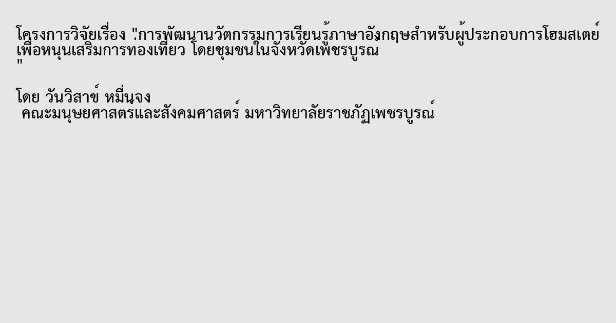 งานวิจัยนี้มีวัตถุประสงค์เพื่อ 1) เพื่อศึกษาปัญหาการใช้ภาษาอังกฤษ และความต้องการจำเป็นในการใช้ภาษาอังกฤษ สำหรับผู้ประกอบการโฮมสเตย์ในจังหวัดเพชรบูรณ์ และ 2) เพื่อพัฒนานวัตกรรมเพื่อการเรียนรู้ภาษาอังกฤษสำหรับผู้ประกอบการโฮมสเตย์เพื่อหนุนเสริมการท่องเที่ยวโดยชุมชนในจังหวัดเพชรบูรณ์ การวิจัยในครั้งนี้เป็นการวิจัยเชิงคุณภาพ ที่ใช้การวิจัยเชิงปฏิบัติการแบบมีส่วนร่วม โดยการสัมภาษณ์แบบกึ่งโครงสร้าง และการสัมภาษณ์กลุ่ม โดยสัมภาษณ์ผู้มีส่วนได้ส่วนเสียในชุมชน จำนวน 15 คน ได้แก่ ผู้ประกอบการโฮมเสตย์ ผลการศึกษาพบว่า กลุ่มตัวอย่างมีปัญหาและข้อจำกัดในการใช้ภาษาอังกฤษเป็นอย่างมาก เนื่องจากส่วนใหญ่ไม่ได้มีโอกาสในการใช้ภาษาอังกฤษเพื่อการสื่อสารกับนักท่องเที่ยวต่างชาติ และไม่รู้คำศัพท์ เรียบเรียงประโยคไม่ได้ นอกจากนี้ ผู้ประกอบการต้องการพัฒนาการฟัง และทักษะการพูดเพื่อการสื่อสาร รวมทั้งสื่อการเรียนรู้ที่เป็นแบบสองภาษา (อังกฤษ-ไทย) ที่มีคำป่าน และคำแปล แบบง่ายๆ และพร้อมใช้งาน และสามารถฝึกด้วยตนเองได้ ส่วนเนื้อหาที่ต้องการที่ต้องการพัฒนาเป็นนวัตกรรมหรือสื่อการเรียนรู้ ได้แก่ การทักทาย การอธิบายห้องพัก การบอกราคาห้องพัก การอธิบายอุปกรณ์ในห้องพัก การบอกโปรแกรมท่องเที่ยวในชุมชน การอธิบายกิจกรรมต่างๆ ที่ทางโฮมสเตย์จัดให้แก่นักท่องเที่ยว เช่น การทำน้ำสลัด การคั่วกาแฟ การเผาข้าวหลาม การอธิบายเมนูอาหารและส่วนประกอบของอาหารพื้นบ้านที่จัดให้แก่นักท่องเที่ยว และสำนวนอื่นๆ ที่จำเป็นต่อการท่องเที่ยวแบบโฮมเสตย์