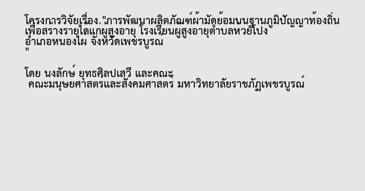 งานวิจัยเรื่อง การพัฒนาผลิตภัณฑ์ผ้ามัดย้อมบนฐานภูมิปัญญาท้องถิ่นเพื่อสร้างรายได้แก่ ผู้สูงอายุ โรงเรียนผู้สูงอายุตำบลห้วยโป่ง อำเภอหนองไผ่ จังหวัดเพชรบูรณ์ มีวัตถุประสงค์เพื่อ 1) เพื่อศึกษาบริบทและข้อมูลพื้นฐานเกี่ยวกับพืชในท้องถิ่นที่นำมาใช้ทำมัดย้อม 2) เพื่อออกแบบและพัฒนาผลิตภัณฑ์ต้นแบบผ้ามัดย้อมบนฐานภูมิปัญญาท้องถิ่นเพื่อสร้างรายได้แก่ผู้สูงอายุ และ 3) เพื่อเผยแพร่องค์ความรู้การทำผ้ามัดย้อมบนฐานภูมิปัญญาท้องถิ่นเพื่อสร้างรายได้แก่ผู้สูงอายุโรงเรียนผู้สูงอายุตำบลห้วยโป่ง อำเภอหนองไผ่ จังหวัดเพชรบูรณ์ โดยวิธีการวิจัยแบบผสมผสาน (Mixed method research) ที่ใช้วิธีการเก็บรวบรวมข้อมูลเชิงคุณภาพและเชิงปริมาณ จากผู้ให้ข้อมูลหลักจากกการเลือกแบบเจาะจงที่เป็นสมาชิกโรงเรียนผู้สูงอายุ ผู้เชี่ยวชาญด้านการออกแบบผลิตภัณฑ์และตัวอย่างกลุ่มผู้บริโภคทั่วไปที่ได้จากการเลือกแบบบังเอิญ ด้วยเครื่องมือแนวคำถามประกอบการสัมภาษณ์ แบบตรวจรายการและแบบประเมินคุณลักษณะของผลิตภัณฑ์ที่ออกแบบและพัฒนาขึ้น โดยการร่างแบบ 2 มิติ และต้นแบบ (Prototype) ผลิตภัณฑ์จำนวน 5 ชิ้น