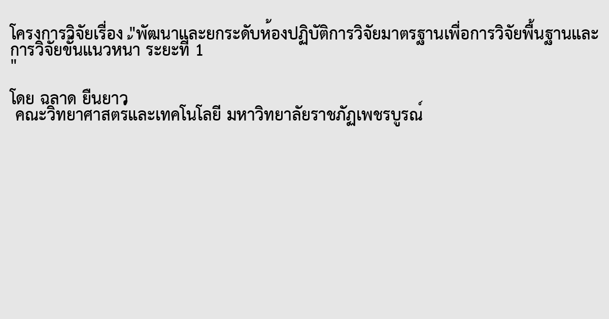งานวิจัยนี้มีวัตถุประสงค์ เพื่อพัฒนาห้องปฏิบัติการวิจัยมาตรฐานสำหรับการวิจัยพื้นฐานและการวิจัยขั้นแนวหน้า ที่อยู่ภายใต้ความดูแลของศูนย์วิทยาศาสตร์ คณะวิทยาศาสตร์และเทคโนโลยี มหาวิทยาลัยราชภัฏเพชรบูรณ์ บนพื้นฐานของสมมติฐานว่า ความพร้อมและเพียงพอของห้องปฏิบัติการมาตรฐาน มีส่วนช่วยให้นักวิจัยทั้งภายในและนอกมหาวิทยาลัยราชภัฏเพชรบูรณ์ สามารถยกระดับการวิจัยและทำให้สามารถผลิตผลงานวิจัยได้อย่างต่อเนื่อง รวมทั้งสามารถดำเนินการวิจัยได้กว้างขวางและคล่องตัวยิ่งขึ้น นอกจากนี้ ยังทำให้ศูนย์วิทยาศาสตร์สามารถขยายขอบเขตการให้บริการสู่ชุมชนท้องถิ่นและชุมชนวิจัย และสามารถนำห้องปฏิบัติการเข้าสู่มาตรฐานความปลอดภัย (ESPReL) และมาตรฐาน ISO/IEC17025 ได้เร็วขึ้น โดยเฉพาะงานวิจัยทางด้านวัสดุศาสตร์ ดังนั้นกิจกรรมวิจัยในโครงการวิจัยนี้จึงมุ่งเตรียมความพร้อมและความเพียงพอของเครื่องมือวิเคราะห์และสังเคราะห์ รวมทั้งอุปกรณ์ความปลอดภัยในการปฏิบัติงานในห้องปฏิบัติการวิจัย และเพิ่มพูนความพร้อมของนักวิทยาศาสตร์ด้วยการให้นักวิทยาศาสตร์ได้เข้ารับการอบรมในเรื่องของมาตรฐานความปลอดภัย มาตรฐานห้องปฏิบัติการ และทักษะการใช้เครื่องมือวิเคราะห์ที่ติดตั้งในห้องปฏิบัติการของศูนย์วิทยาศาสตร์ ผลการวิจัยในส่วนของการเตรียมความพร้อมทางกายภาพ พบว่า ได้จัดหาเครื่องมือวิเคราะห์ทางวัสดุศาสตร์จำนวน 2 เครื่อง คือ เครื่องวิเคราะห์ผลึกด้วยการวิเคราะห์การเลี้ยวเบนรังสีเอกซ์ (X-ray diffractometer, XRD) แบบตั้งโต๊ะ และเครื่องวิเคราะห์สมบัติผิวของวัสดุ นอกจากนี้ได้จัดหาถังบรรจุไนโตรเจนเหลวและครุภัณฑ์ห้องปฏิบัติการ ถังไนโตรเจนเหลวถูกจัดหาไว้สำหรับใช้ในการวิจัยและการเตรียมตัวอย่าง ขณะที่ครุภัณฑ์ห้องปฏิบัติการใหม่ได้ถูกนำไปทดแทนครุภัณฑ์เดิมที่ไม่สอดคล้องกับคุณลักษณะทางกายภาพของห้องปฏิบัติการปลอดภัยตามแนวทาง ESPReL และช่วยลดความเสี่ยงที่เครื่องแก้วจะเสียหายด้วย นอกจากครุภัณฑ์ห้องปฏิบัติการ เครื่องมือวิเคราะห์และอุปกรณ์ที่จำเป็น ผู้วิจัยได้จัดหาวัสดุอุปกรณ์ป้องกันอันตรายประจำตัว เพื่อความปลอดภัยในการทำงานในห้องปฏิบัติการด้วย เช่น ถุงมือกันร้อน ถุงมือยาง เสื้อคลุม หน้ากาก และแว่นตา รองเท้าบูท เป็นต้น ในส่วนของการเตรียมความพร้อมบุคลากรประจำห้องปฏิบัติการของศูนย์วิทยาศาสตร์ พบว่า นักวิทยาศาสตร์ของศูนย์วิทยาศาสตร์ นักวิจัยและผู้ช่วยนักวิจัยได้เข้ารับการอบรมในหลักสูตรต่าง ๆ ที่เกี่ยวกับการยกระดับมาตรฐานการวิเค