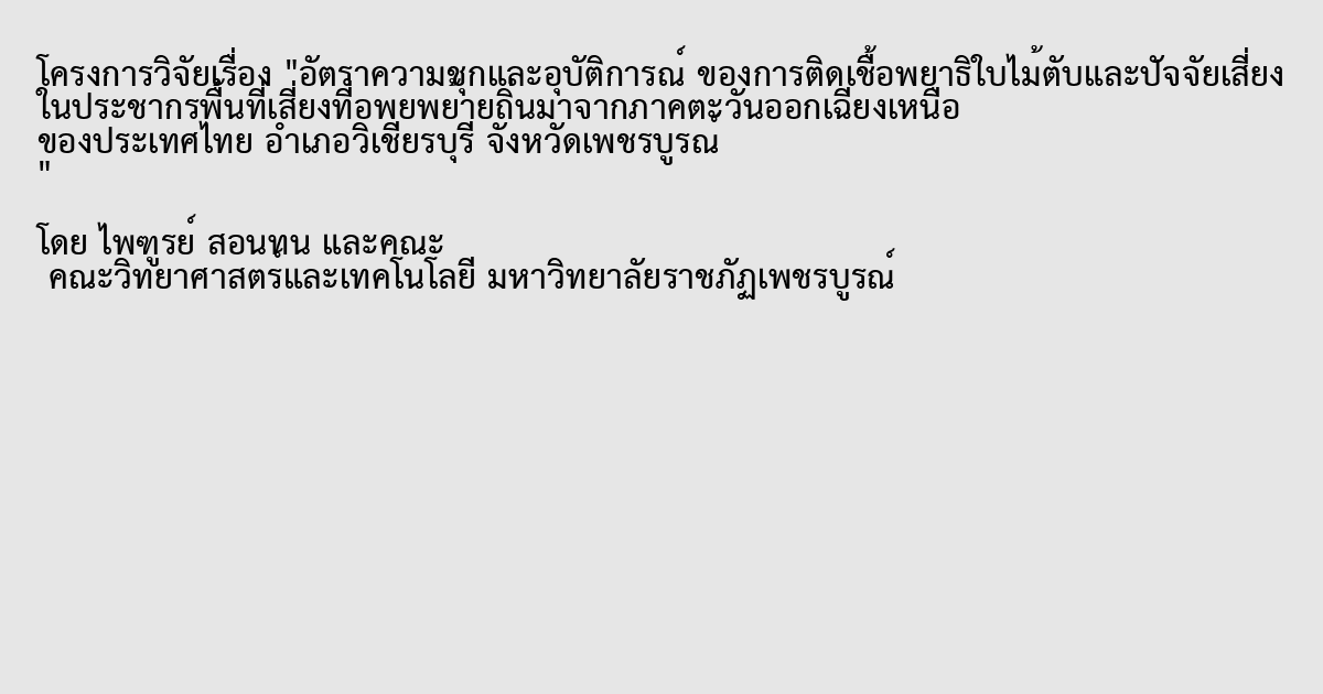 งานวิจัยนี้มีวัตถุประสงค์เพื่อวัดอัตราความชุกของการติดเชื้อพยาธิใบไม้ตับและทดสอบความสัมพันธ์ระหว่างปัจจัยต่างๆกับการติดเชื้อด้วยพยาธิใบไม้ตับ เป็นการวิจัยแบบผสมผสานวิธี (Mixed method) การศึกษาเชิงปริมาณใช้แบบสอบถามและการตรวจวิเคราะห์อุจจาระด้วยกล้องจุลทรรศน์แบบวิธี Kato’s thick smear เก็บรวบรวมข้อมูลจากประชากรพื้นที่เสี่ยงที่อพยพย้ายถิ่นมาจากภาคตะวันออกเฉียงเหนือ ที่มีอายุ 15 ปีขึ้นไป 1,868 คน วิเคราะห์ข้อมูลด้วยสถิติ Multiple logistic regression ด้วยโปรแกรม R Version 3.2.4 และนำเสนอ Adjusted odds ratio (AOR) พร้อมช่วงเชื่อมั่น (95% CI) และค่า p-value การศึกษาเชิงคุณภาพ เก็บรวบรวมข้อมูลโดยการสัมภาษณ์เชิงลึก (Indebt interview) จากกลุ่มตัวอย่างที่ติดเชื้อ 20 คน วิเคราะห์ข้อมูลด้วยการวิเคราะห์เชิงเนื้อหา (Content analysis)
