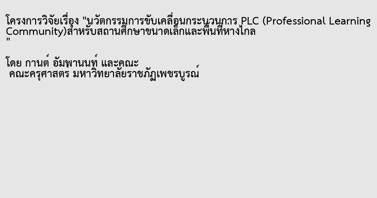 การวิจัยเรื่อง “นวัตกรรมการขับเคลื่อนกระบวนการ PLC (Professional Learning Community) สำหรับสถานศึกษาขนาดเล็กและพื้นที่ห่างไกล”ครั้งนี้ เป็นการวิจัยเพื่อพัฒนาโดยมีวัตถุประสงค์ 1) เพื่อสร้างนวัตกรรมการขับเคลื่อนกระบวนการ PLC (Professional Learning Community) สำหรับสถานศึกษาขนาดเล็กและพื้นที่ห่างไกล 2) เพื่อนำนวัตกรรมการขับเคลื่อนกระบวนการ PLC (Professional Learning Community) ไปใช้กับสถานศึกษาเครือข่าย สถานศึกษาขนาดเล็กและพื้นที่ห่างไกล 3) เพื่อยืนยันนวัตกรรมการขับเคลื่อนกระบวนการ PLC (Professional Learning Community) สำหรับสถานศึกษาขนาดเล็กและพื้นที่ห่างไกล