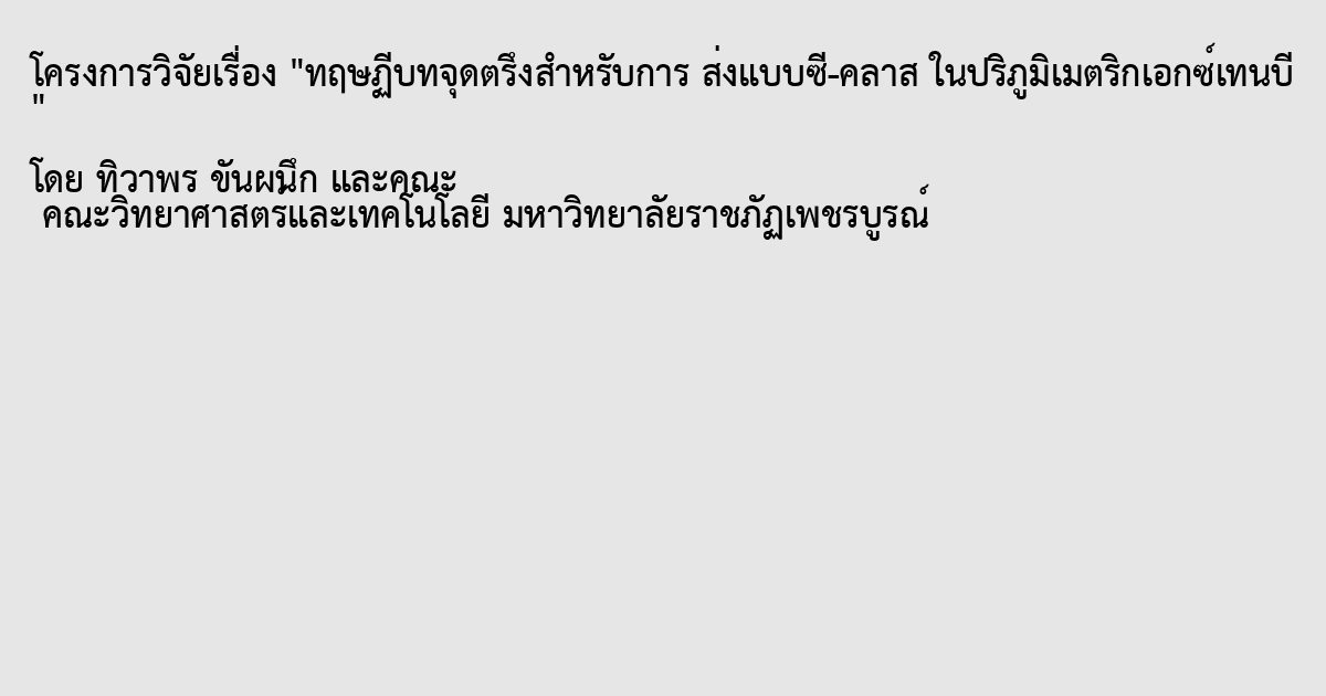 ในงานวิจัยนี้มีจุดมุ่งหมายเพื่อคิดค้นทฤษฎีและองค์ความรู้ใหม่ ๆ พร้อมทั้งสร้างตัวอย่าง ประกอบเกี่ยวกับทฤษฎีบทจุดตรึงสำหรับการส่งแบบซี – คลาส ในปริภูมิเมตริกเอกซ์เทนบี ผลจากการวิจัยพบว่า ถ้า \(X\) เป็นเซตที่ไม่ใช่เซตว่าง \({d_\theta }\) เป็นฟังก์ชันจาก \(X \times X\)ไปยัง \([1,\infty )\) และ \((X,{d_\theta })\) เป็นปริภูมิเอกซ์เทนบีเมตริก บน \(X\) และ \(f:X \to X\) ซึ่ง \(\theta :X \times X \to [1,\infty )\) โดยที่ สำหรับทุก ๆ \(x,y \in X\)