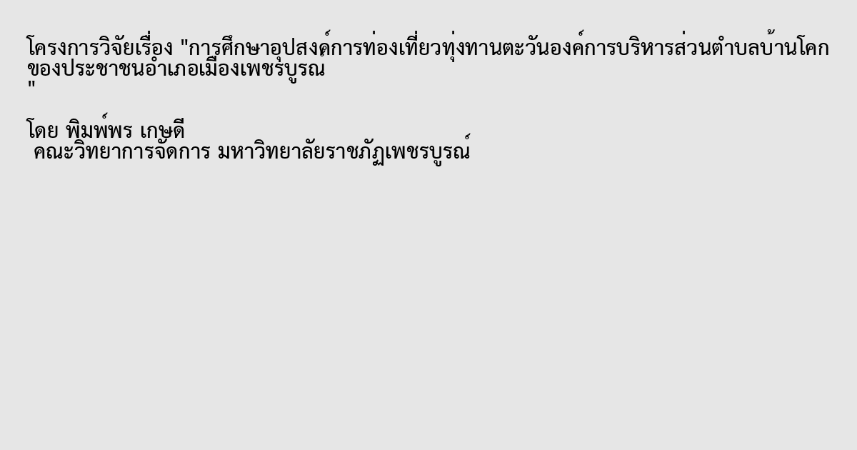 การศึกษาอุปสงค์การท่องเที่ยวทุ่งทานตะวันองค์การบริหารส่วนตำบลบ้านโคก ของประชาชนอำเภอเมืองเพชรบูรณ์ มีวัตถุประสงค์เพื่อศึกษาอุปสงค์การท่องเที่ยวทุ่งทานตะวันองค์การบริหารส่วนตำบลบ้านโคก ของประชาชนอำเภอเมืองเพชรบูรณ์ โดยใช้วิธีการเลือกตัวอย่างของ Yamane ได้เสนอสูตรการคำนวณขนาดตัวอย่างสัดส่วน 1 กลุ่ม โดยสมมติค่าสัดส่วนเท่ากับ 0.5 และระดับความเชื่อมั่น 95% ขนาดตัวอย่างของการศึกษาครั้งนี้จึงเท่ากับ 400 คน โดยมีเครื่องมือได้แก่แบบสอบสอบ พบว่า ส่วนใหญ่เป็นเพศหญิง จำนวน 275 คน และเพศชาย จำนวน 125 คน ส่วนใหญ่อายุไม่เกิน 25 ปี จำนวน 141 คน รองลงมาอายุ 26-35 ปี จำนวน 85 คน และน้อยที่สุดคืออายุ 60 ปีขึ้นไป จำนวน 30 คน ส่วนใหญ่มีระดับการศึกษาต่ำกว่าปริญญาตรี จำนวน 198 คน และรองลงมาได้แก่ระดับปริญญาตรีจำนวน 127 คน ส่วนใหญ่ประกอบอาชีพนักเรียน /นักศึกษา จำนวน 187 คน รองลงมาได้แก่อาชีพข้าราชการ /พนักงานรัฐวิสาหกิจ จำนวน 89 คน ส่วนใหญ่มีรายได้เฉลี่ยต่อเดือนระหว่าง 5,000 - 10,000 บาท จำนวน 198 คน และมีรายได้เฉลี่ยต่อเดือน ระหว่าง 10,001 - 15,000 บาท จำนวน 157 คน ด้านพฤติกรรมการท่องเที่ยว ส่วนใหญ่เป็นครั้งแรก จำนวน 280 คน และครั้งที่ 2 หรือมากกว่า จำนวน 120 คน ส่วนใหญ่เดินทางโดยรถยนต์ จำนวน 233 คน และรองลงมาเดินทางโดยรถจักรยานยนต์ จำนวน 167 คน ส่วนใหญ่เดินทางมาเที่ยวกับเพื่อน /เพื่อนร่วมงาน จำนวน 229 คน รองลงมาได้แก่ญาติ / คนในครอบครัว จำนวน 151 คน ส่วนใหญ่บุคคลที่มีส่วนสำคัญต่อการตัดสินใจมาเที่ยวทุ่งทานตะวันองค์การบริหารส่วนตำบลกับเพื่อน /เพื่อนร่วมงาน จำนวน 168 คน รองลงมาได้แก่ตัวท่านเอง จำนวน 112 คน คน ส่วนใหญ่สื่อที่รับรู้/ รู้จักทุ่งทานตะวันองค์การบริหารส่วนตำบลจากอินเตอร์เน็ต สื่อสังคมออนไลน์ (เฟสบุ๊ค /อินสตราแกรม ) จำนวน 198 คน รองลงมาได้แก่เพื่อน / เพื่อนร่วมงาน จำนวน 157 คน ระดับปัจจัยที่มีผลต่อการเลือกเดินทางไปท่องเที่ยวทุ่งทานตะวันองค์การบริหารส่วนตำบลบ้านโคกของประชาชนอำเภอเมืองเพชรบูรณ์ โดยภาพรวมอยู่ในระดับมาก ( x̄ = 3.77 , S.D. = 0.69 ) ส่วนการทดสอบความสัมพันธ์ระหว่างตัวแปรตามและตัวแปรอิสระ ปัจจัยที่มีอิทธิพลต่อการตัดสินใจเดินทางไปท่องเที่ยวทุ่งทานตะวันองค์การบริหารส่วนตำบลบ้านโคก ของประชาชนเมืองเพชรบูรณ์ ได้แก่ อินเตอร์เน็ต สื่อสังคมออนไลน์ (เฟสบุ๊ค /อินสตราแกรม )มีผลต่อการตัดสินใจท่องเที่ยวทุ่งทานตะวันองค์การบริหารส่วนตำบลบ้านโคก ของประชาชนอำเภอเมืองเพชรบูรณ์