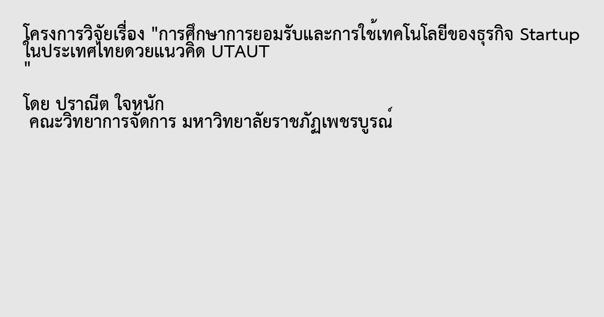 งานวิจัยนี้นาเสนอการศึกษาการยอมรับและการใช้เทคโนโลยีของกลุ่มธุรกิจ Startup ในประเทศไทยด้วยแนวคิด UTAUT โดยมีวัตถุประสงค์ 2 ประการ ได้แก่ 1) เพื่อศึกษาความสัมพันธ์ของตัวแปรที่ส่งผลต่อการยอมรับการใช้เทคโนโลยีทางการตลาดของกลุ่มธุรกิจ Startup ในประเทศไทยด้วยแนวคิด UTAUT และ 2) เพื่อศึกษาความสัมพันธ์ของตัวแปรด้านประชากรศาสตร์ที่ส่งผลต่อการยอมรับการใช้เทคโนโลยีทางการตลาดของกลุ่มธุรกิจ Startup ในประเทศไทย