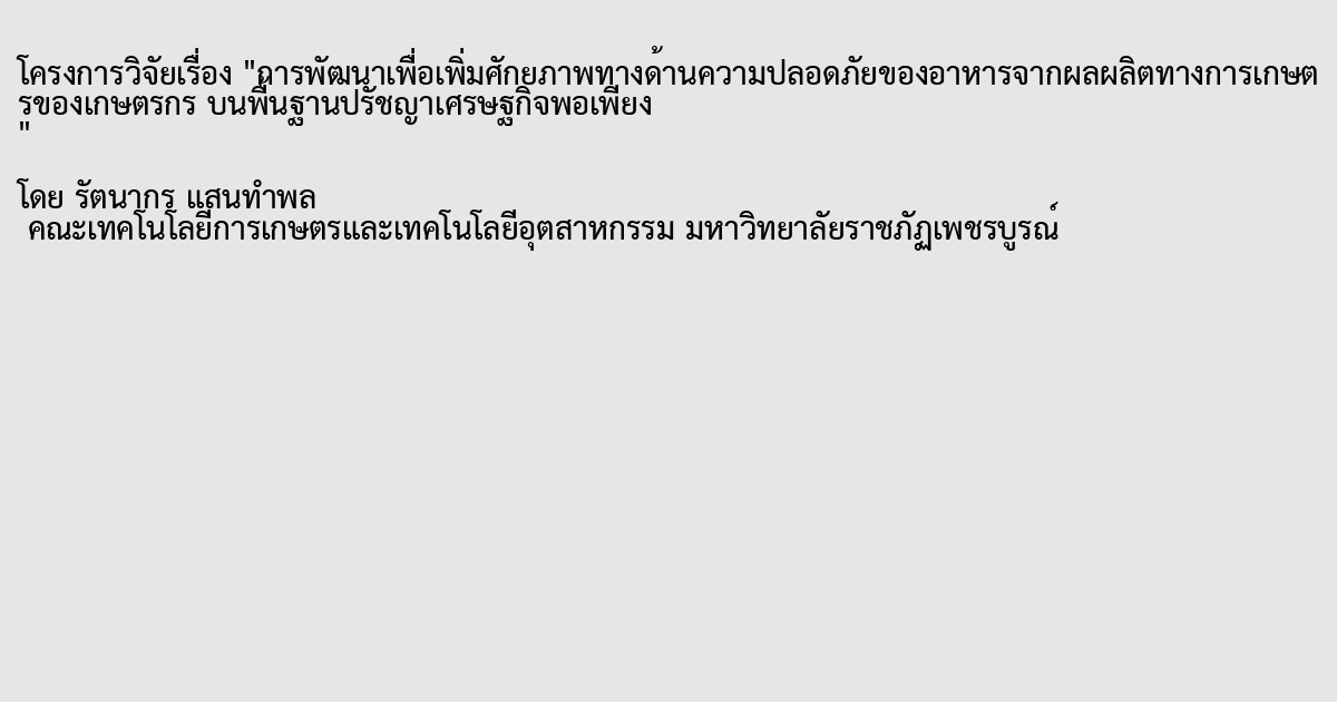 งานวิจัยนี้มีวัตถุประสงค์ เพื่อสารวจความเข้าใจต่อความปลอดภัยของอาหารของกลุ่มเกษตรกรในจังหวัดเพชรบูรณ์ เพื่อถ่ายทอดองค์ความรู้ ระบบการผลิตและมาตรฐานที่ปลอดภัยทางการเกษตร ต่อความปลอดภัยของอาหารแก่กลุ่มเกษตรกรในจังหวัดเพชรบูรณ์ และเพื่อพัฒนาต่อยอดสินค้าเกษตรในชุมชนสู่ระบบอาหารปลอดภัย บนพื้นฐานปรัชญาเศรษฐกิจพอเพียง ซึ่งโครงการวิจัยนี้ เป็นการวิจัยเชิงปฏิบัติการแบบมีส่วนร่วม (Participatory Action Research, PAR) โดยวิธีการดาเนินการวิจัยแบ่งออกเป็น 3 ขั้นตอน ได้แก่ 1) สารวจความเข้าใจต่อความปลอดภัยของอาหารของกลุ่มเกษตรกรในจังหวัดเพชรบูรณ์ โดยการใช้แบบสอบถาม จานวน 200 ชุด 2) การถ่ายทอดองค์ความรู้ ระบบการผลิตและมาตรฐานที่ปลอดภัยทางการเกษตร ต่อความปลอดภัยของอาหารแก่กลุ่มเกษตรกรในจังหวัดเพชรบูรณ์ โดยจัดอบรมถ่ายทอดความรู้ให้กับเกษตรกร 3) การพัฒนาและต่อยอดสินค้าเกษตรในชุมชนสู่ระบบอาหารปลอดภัย บนพื้นฐานปรัชญาเศรษฐกิจพอเพียง โดยจัดอบรมเชิงปฏิบัติการให้กับเกษตรกร สถิติที่ใช้ในการวิเคราะห์ข้อมูล ได้แก่ ร้อยละ ค่าเฉลี่ย ส่วนเบี่ยงเบนมาตรฐาน