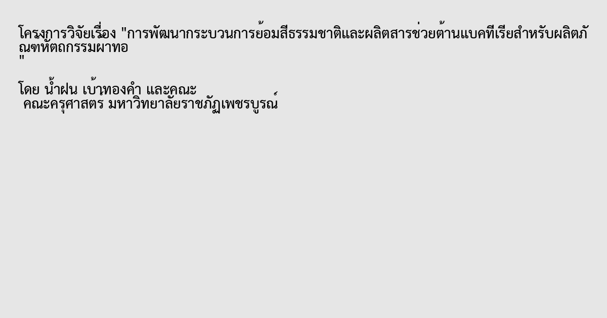 2. เพื่อการพัฒนาผลิตภัณฑ์สารช่วยย้อมผ้าต้านเชื้อแบคทีเรียจากสารธรรมชาติ
