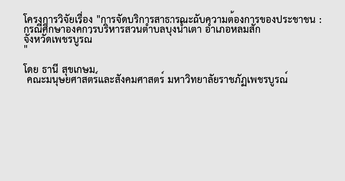 Organization, Lomsak, Phetchabun 2) to advice the solution and suggest the best way for develop public service of Bung Nam Tao, Sub-District Administrative Organization, Lomsak, Phetchabun