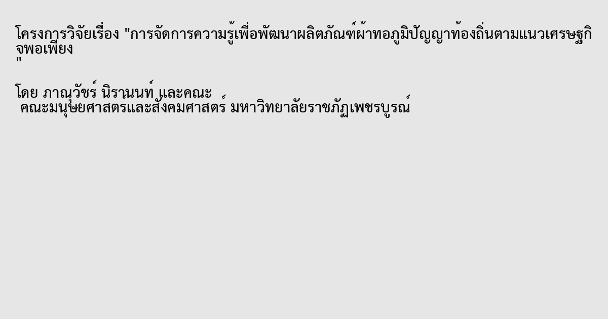 การวิจัยเรื่อง การจัดการความรู้เพื่อพัฒนาผลิตภัณฑ์ผ้าทอภูมิปัญญาท้องถิ่น ตามแนวเศรษฐกิจพอเพียง มีวัตถุประสงค์ เพื่อศึกษาการจัดการความรู้ผลิตภัณฑ์ผ้าทอภูมิปัญญาท้องถิ่นตามแนวเศรษฐกิจพอเพียงและเพื่อพัฒนาผลิตภัณฑ์ผ้าทอภูมิปัญญาท้องถิ่นตามแนวเศรษฐกิจพอเพียง การวิจัยนี้เป็นการวิจัยเชิงคุณภาพ (Qualitative Research) เครื่องมือที่ใช้ ได้แก่ แบบการสัมภาษณ์เชิงลึก (In-depth Interview) รวมทั้งศึกษาข้อมูลจากเอกสารและงานวิจัยที่เกี่ยวข้องการจัดการความรู้ และผ้าทอภูมิปัญญาท้องถิ่น ผู้วิจัยดำเนินการสังเคราะห์เอกสารและงานวิจัยที่เกี่ยวข้อง วิเคราะห์ข้อมูลโดยวิธีการวิเคราะห์เนื้อหา (Content Analysis)