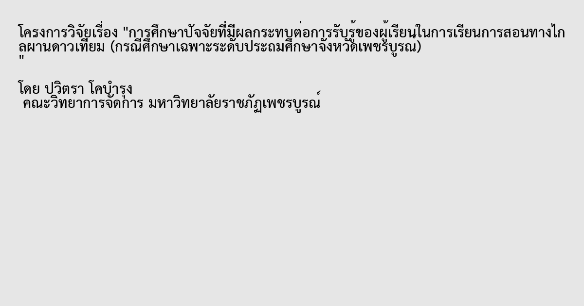 การศึกษาปัจจัยที่มีผลกระทบต่อการรับรู้ของผู้เรียนในการเรียนการสอนทางไกลผ่านดาวเทียม (กรณีศึกษาเฉพาะระดับประถมศึกษาจังหวัดเพชรบูรณ์)