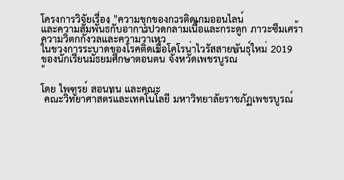 ความชุกของการติดเกมออนไลน์ และความสัมพันธ์กับอาการปวดกล้ามเนื้อและกระดูก ภาวะซึมเศร้า ความวิตกกังวลและความว้าเหว่ ในช่วงการระบาดของโรคติดเชื้อโคโรน่าไวรัสสายพันธุ์ใหม่ 2019 ของนักเรียนมัธยมศึกษาตอนต้น จังหวัดเพชรบูรณ์