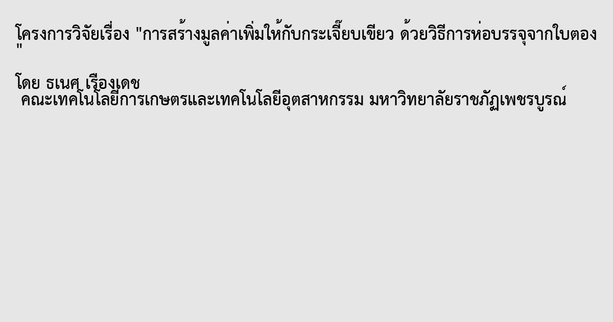 งานวิจัยเรื่องนี้มีวัตถุประสงค์เพื่อ 1) เพื่อพัฒนารูปแบบการห่อบรรจุกระเจี๊ยบเขียวจากใบตอง โดยออกแบบวิธีการห่อบรรจุกระเจี๊ยบเขียวจากใบตองจำนวน 5 รูปแบบเสนอต่อ ผู้เชี่ยวชาญจำนวน 3 ท่านเพื่อประเมินความเหมาะสมโดยใช้แบบประเมินความเหมาะสมของผู้เชี่ยวชาญที่มีต่อรูปแบบการห่อกระเจี๊ยบเขียวจากใบตอง 2) เพื่อศึกษาอายุการเก็บรักษากระเจี๊ยบเขียวที่ห่อบรรจุด้วยใบตอง โดยการบันทึกการเปลี่ยนแปลงน้ำหนักสด ดำเนินการทดลองโดยใช้แผนการทดลองแบบ completely randomizd design (CRD) วิเคราะห์ความแปรปรวน (Analysis of Variance : ANOVA) และหาความแตกต่างของค่าเฉลี่ยของข้อมูลด้วยวิธี Duncan’s New Multiple Test (DMRT) ที่ระดับความเชื่อมั่นร้อยละ 95 (p<0.05)