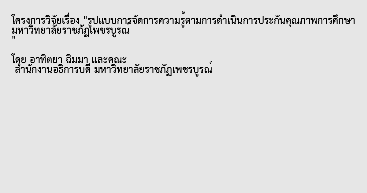 งานวิจัยนี้มีวัตถุประสงค์ เพื่อวิเคราะห์แนวทางการจัดการความรู้ตามการดำเนินการประกันคุณภาพการศึกษา และเพื่อสร้างรูปแบบทางการจัดการความรู้ตามการดำเนินการประกันคุณภาพการศึกษา รวมถึงการประเมินรูปแบบทางการจัดการความรู้ตามการดำเนินการประกันคุณภาพการศึกษา ของมหาวิทยาลัยราชภัฏเพชรบูรณ์ วิธีดำเนินการวิจัยมี 4 ระยะ คือ ระยะที่ 1 วิเคราะห์แนวทางการจัดการความรู้ตามการดำเนินการประกันคุณภาพการศึกษา โดยใช้วิธีการวิเคราะห์ผลการดำเนินงานการจัดการความรู้ ตามผลประเมินคุณภาพการศึกษา ประจำปีการศึกษา 2563 ระยะที่ 2 การพัฒนา (Development : D1) มีวัตถุประสงค์เพื่อสร้างรูปแบบทางการจัดการความรู้ตามการดำเนินการประกันคุณภาพการศึกษามหาวิทยาลัยราชภัฏเพชรบูรณ์ ระยะที่ 3 การวิจัย (Research : R2) มีวัตถุประสงค์เพื่อทดลองใช้รูปแบบทางการจัดการความรู้ตามการดำเนินการประกันคุณภาพการศึกษามหาวิทยาลัยราชภัฏเพชรบูรณ์ 1 หน่วยงาน ระยะที่ 4 การวิจัย (Research : R3) เป็นการวิจัยเชิงประเมินมีวัตถุประสงค์เพื่อประเมินรูปแบบทางการจัดการความรู้ตามการดำเนินการประกันคุณภาพการศึกษา ของมหาวิทยาลัยราชภัฏเพชรบูรณ์ ได้รูปแบบการจัดการความรู้ตามการดำเนินการประกันคุณภาพการศึกษาผ่านการจัดการความรู้ที่มีการเชื่อมต่อองค์ประกอบ ขั้นตอน การจัดการความรู้และส่งผลต่อกัน ด้วยกระบวนการตามวงจรเดมมิ่ง องค์ประกอบการจัดการความรู้ คือ คนกระบวนการ และเทคโนโลยีสารสนเทศ ขั้นตอนการจัดการความรู้แบ่งเป็น 6 ขั้นตอน คือ 1) การกำหนดความรู้หลักที่จำเป็นหรือสำคัญต่องานหรือกิจกรรมของกลุ่มหรือองค์กร 2) การเสาะหาความรู้ที่ต้องการ 3) การปรับปรุง ดัดแปลง หรือสร้างความรู้บางส่วน ให้เหมาะต่อการใช้งานของตน 4) การประยุกต์ใช้ความรู้ในกิจการงานของตน 5) การนำประสบการณ์จากการทำงาน และการประยุกต์ใช้ความรู้มาแลกเปลี่ยนเรียนรู้ และสกัด “ขุมความรู้” ออกมาบันทึกไว้ 6) การจดบันทึก “ขุมความรู้” และ “แก่นความรู้” สำหรับไว้ใช้งาน และปรับปรุงเป็นชุดความรู้ที่ครบถ้วน ลุ่มลึกและเชื่อมโยงมากขึ้น เหมาะต่อการใช้งานมากยิ่งขึ้น