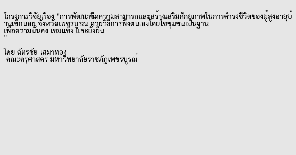 งานวิจัยนี้มีวัตถุประสงค์ คือ 1) เพื่อศึกษาพฤติกรรมและความต้องการของผู้สูงอายุบ้านเข็กน้อยที่จะพัฒนาตนเองเพื่อความอยู่รอดในสังคม และนำไปสู่ความมั่นคง เข้มแข็ง และยั่งยืน 2) เพื่อศึกษาปัจจัยที่เป็นปัญหาและส่งเสริมปัจจัยที่ส่งผลต่อการดำรงชีวิตของผู้สูงอายุบ้านเข็กน้อยด้วยวิธีการพึ่งตนเองโดยใช้ชุมชนเป็นฐาน 3) เพื่อออกแบบกลยุทธ์ในการสร้างเสริมศักยภาพในการดำรงชีวิตของผู้สูงอายุบ้านเข็กน้อย จังหวัดเพชรบูรณ์ ด้วยวิธีการพึ่งตนเองโดยใช้ชุมชนเป็นฐานเพื่อความมั่นคง เข้มแข็ง และยั่งยืน 4) เพื่อประเมินความรู้และความสามารถของผู้สูงอายุหลังจากการพัฒนาขีดความสามารถและสร้างเสริมศักยภาพในการดำรงชีวิตของผู้สูงอายุบ้านเข็กน้อย จังหวัดเพชรบูรณ์ ด้วยวิธีการพึ่งตนเองโดยใช้ชุมชนเป็นฐานเพื่อความมั่นคง เข้มแข็ง และยั่งยืน