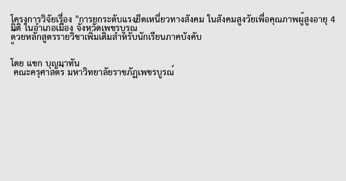 ผลการยกระดับแรงยึดเหนี่ยวทางสังคมในสังคมสูงวัยเพื่อคุณภาพผู้สูงอายุ 4 มิติในอำเภอเมือง จังหวัดเพชรบูรณ์ด้วยหลักสูตรรายวิชาเพิ่มเติมสำหรับนักเรียนภาคบังคับ พบว่า ระดับแรงยึดเหนี่ยวทางสังคมในสังคมสูงวัยของบุคคลในครอบครัวของนักเรียนชั้นประถมศึกษาปีที่ 1-3 หลังใช้หลักสูตรสหวิทยาการ เรื่อง องค์ความรู้บูรณาการวัฒนธรรมท้องถิ่นเพื่อใช้ชีวิตร่วมกันในสังคมอย่างมีคุณภาพของนักเรียนชั้นประถมศึกษาปีที่ 1-3 สูงกว่าก่อนใช้หลักสูตรอย่างมีระดับนัยสำคัญที่ระดับ 0.00 ส่วนระดับแรงยึดเหนี่ยวทางสังคมในสังคมสูงวัยของบุคคลในครอบครัวของนักเรียนชั้นประถมศึกษาปีที่ 4-6 หลังใช้หลักสูตรรายวิชาเพิ่มเติม เรื่อง สหวิทยาการผสานวัฒนธรรมท้องถิ่นเพื่อการใช้ชีวิตร่วมกันในสังคมสูงวัยอย่างมีคุณภาพ สูงกว่าก่อนใช้หลักสูตรอย่างมีระดับนัยสำคัญที่ระดับ 0.00 และในระดับชั้นมัธยมศึกษาปีที่ 1-3 พบว่า ผู้เรียนมีความรู้ความเข้าใจ เรื่อง การดูแลผู้สูงอายุที่สอดคล้องบริบท ก่อนการใช้หลักสูตร มีค่าเฉลี่ยเท่ากับ 14.79 ส่วนเบี่ยงเบนมาตรฐานเท่ากับ 2.81 หลังการทดลองใช้หลักสูตร มีค่าเฉลี่ยเท่ากับ 26.61ส่วนเบี่ยงเบนมาตรฐานเท่ากับ 1.87 และผลการเปรียบเทียบความรู้ความเข้าใจ เรื่อง การดูแลผู้สูงอายุที่สอดคล้องบริบท หลังการใช้หลักสูตร สูงกว่าก่อนการใช้หลักสูตรอย่างมีนัยสำคัญทางสถิติที่ระดับ .05