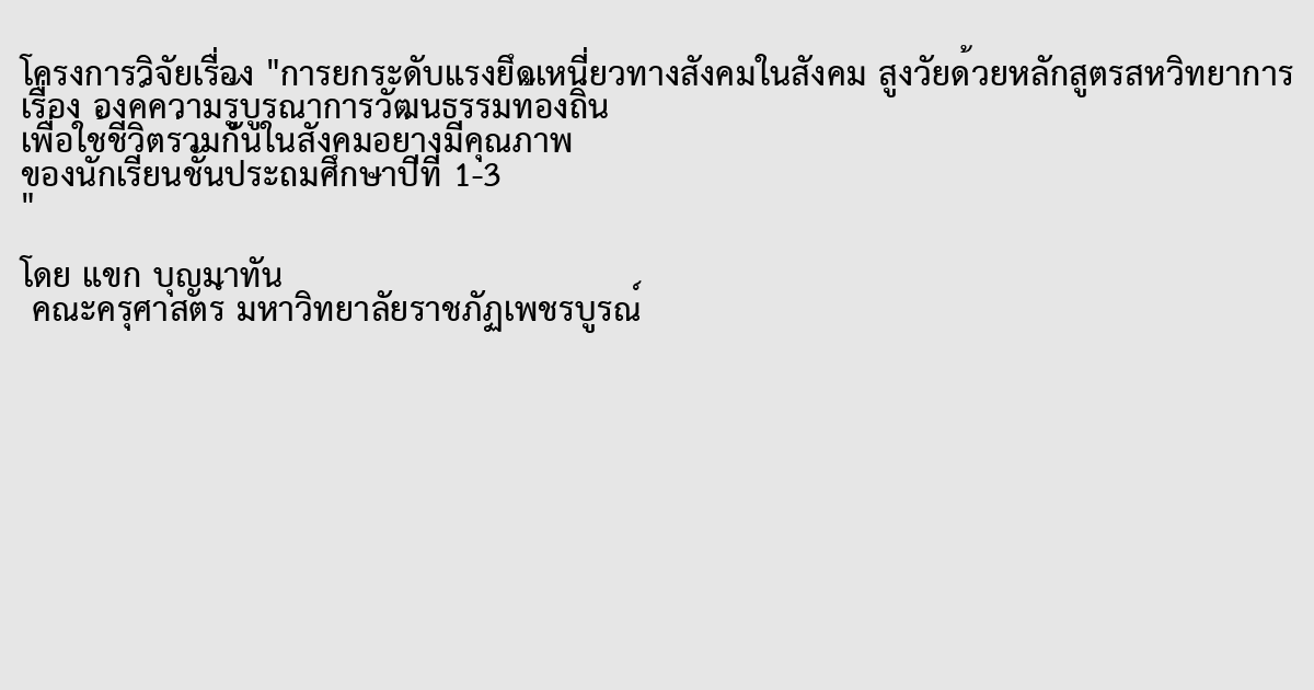 4. ผลการเปรียบเทียบระดับแรงยึดเหนี่ยวทางสังคมในสังคมสูงวัยทั้งของผู้เรียนและบุคคลในครอบครัวก่อนและหลังใช้หลักสูตรสหวิทยาการ เรื่อง องค์ความรู้บูรณาการวัฒนธรรมท้องถิ่นเพื่อใช้ชีวิตร่วมกันในสังคมอย่างมีคุณภาพของนักเรียนชั้นประถมศึกษาปีที่ 1-3 พบว่า ระดับแรงยึดเหนี่ยวทางสังคมในสังคมสูงวัยของผู้เรียนก่อนและหลังฯ ของนักเรียนชั้นประถมศึกษาปีที่ 1-3 หลังใช้หลักสูตรสหวิทยาการ เรื่อง องค์ความรู้บูรณาการวัฒนธรรมท้องถิ่นเพื่อใช้ชีวิตร่วมกันในสังคมอย่างมีคุณภาพของนักเรียนชั้นประถมศึกษาปีที่ 1-3 สูงกว่าก่อนใช้หลักสูตรอย่างมีระดับนัยสำคัญที่ระดับ 0.00