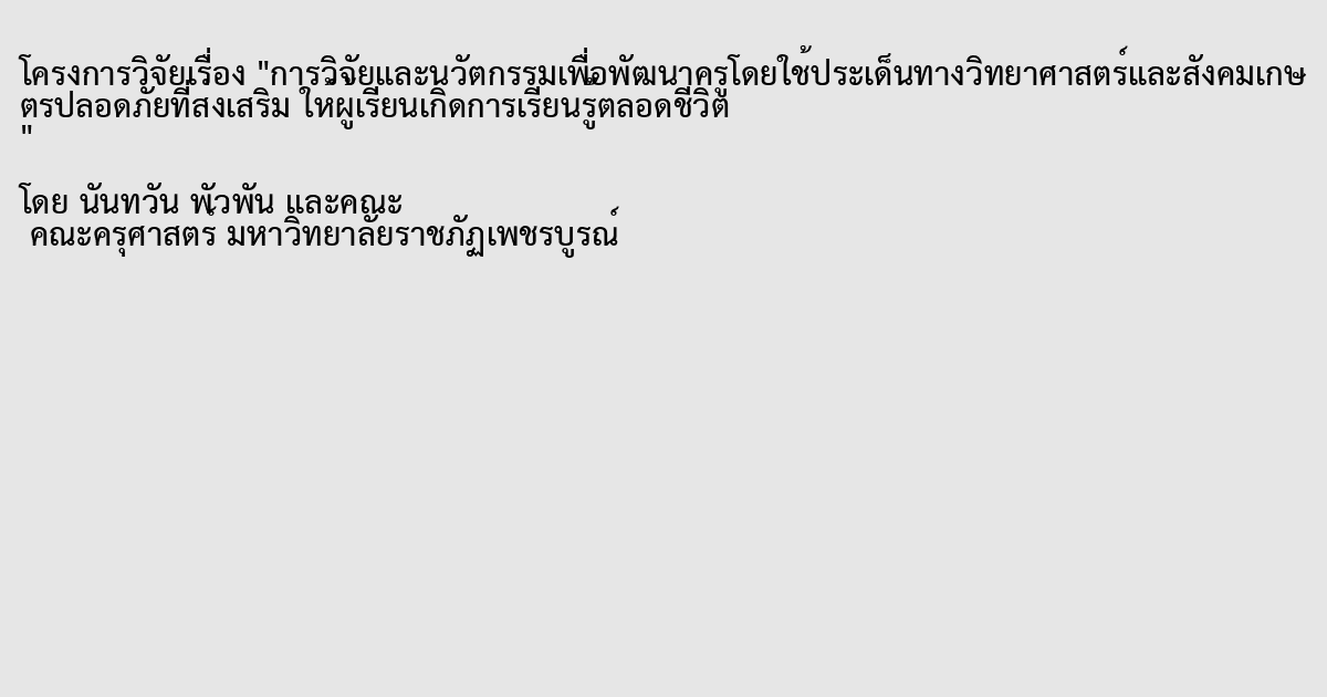 ชุดแผนโครงการวิจัยครั้งนี้ มีวัตถุประสงค์ เพื่อ 1) ศึกษาและพัฒนาระบบการผลิตครูในการจัดการเรียนรู้ที่เน้นสมรรถนะความรู้เนื้อหาเผนวกวิธีสอนและเทคโนโลยี 2) เพื่อพัฒนากระบวนการสร้างเกมกระดานผนวกเทคโนโลยีสื่อเสมือนจริง และ 3) เพื่อพัฒนานวัตกรรมตามแนวทางสะเต็มศึกษา โดยใช้ประเด็นทางวิทยาศาสตร์และสังคมเกษตรปลอดภัยให้ผู้เรียนเกิดการเรียนรู้ตลอดชีวิตอย่างยั่งยืน กลุ่มที่ศึกษา มีทั้งนักศึกษาสาขาวิชาวิทยาศาสตร์ทั่วไปชั้นปีที่ 2 และชั้นปีที่ 4 จำนวนทั้งสิ้น 72 คน และครูวิทยาศาสตร์จำนวน 5 คน ผู้วิจัยใช้การเลือกอย่างเจาะจง และมีวิธีการหาคุณภาพของเครื่องมือโดยผ่านผู้เชี่ยวชาญทั้ง 3 ท่าน วิเคราะห์ข้อมูลเชิงปริมาณโดยใช้สถิติเชิงบรรยายและวิเคราะห์ข้อมูลเชิงคุณภาพด้วยวิธีการวิเคราะห์เนื้อหา ผลการวิจัยพบว่า ระบบการผลิตครูในการจัดการเรียนรู้ที่เน้นสมรรถนะความรู้เนื้อหาเผนวกวิธีสอนและเทคโนโลยี โดยใช้ประเด็นทางวิทยาศาสตร์และสังคมเกษตรปลอดภัยได้ สังเคราะห์ได้ทั้งหมด 4 ขั้นในการจัดการเรียนรู้และผู้วิจัยได้ทำการประเมินสมรรถนะความรู้เนื้อหาผนวกวิธีสอนและเทคโนโลยี พบว่า นักศึกษาส่วนมากจำนวน 26 คน คิดเป็นร้อยละ 70.30 มีสมรรถนะอยู่ในระดับมาก กระบวนการสร้างเกมกระดานผนวกเทคโนโลยีสื่อเสมือนจริง ครูวิทยาศาสตร์มีความสามารถในการสร้างเกมกระดานผนวกการใช้เทคโนโลยีสื่อเสมือนจริง และนำความสามารถนี้ไปใช้พัฒนารูปแบบการสร้างเกมกระดานผนวกการใช้เทคโนโลยีสื่อเสมือนจริงได้ ส่วนนวัตกรรมตามแนวทางสะเต็มศึกษา โดยมีค่า IOC อยู่ที่ 0.93 ซึ่งจากการประเมินประสิทธิภาพค่า IOC อยู่ ในช่วง 0.5 –1.00 ซึ่งเป็นค่าที่สามารถนำไปใช้ได้ และได้นำนวัตกรรมไปถ่ายทอดนวัตกรรม ผลการถ่ายทอดพบว่า ผู้ที่เข้าร่วมโครงการมีความพึงพอใจต่อการเข้าร่วมโครงการฯ อยู่ในระดับมากที่สุด โดยมีค่าเฉลี่ยอยู่ที่ 4.66 ค่าส่วนเบี่ยงเบนมาตรฐานอยู่ที่ 0.56