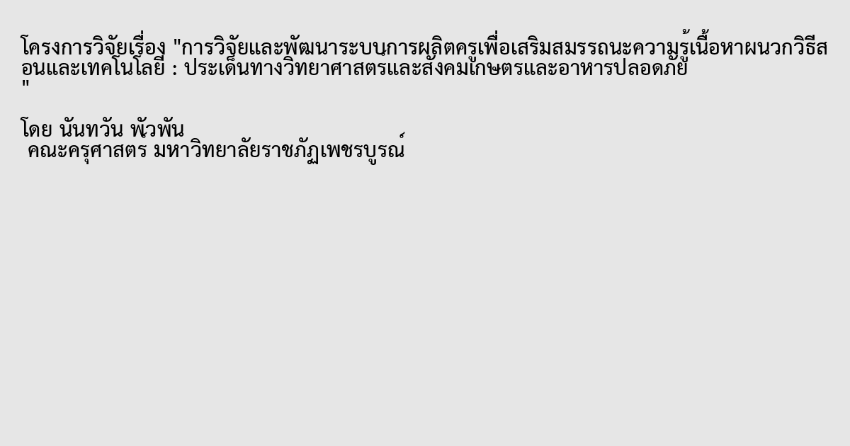 การวิจัยครั้งนี้ มีวัตถุประสงค์ 1.เพื่อศึกษารูปแบบการพัฒนาระบบการผลิตครูในการจัดการเรียนรู้เพื่อเสริมสมรรถนะความรู้เนื้อหาผนวกวิธีสอนและเทคโนโลยี โดยใช้ประเด็นทางวิทยาศาสตร์และสังคมเกษตรปลอดภัย และ 2.เพื่อศึกษาผลของการนำการจัดการเรียนรู้เพื่อเสริมสมรรถนะความรู้เนื้อหาผนวกวิธีสอนและเทคโนโลยี โดยใช้ประเด็นทางวิทยาศาสตร์และสังคมเกษตรปลอดภัย ไปใช้ในระหว่างฝึกประสบการณ์วิชาชีพครูของนักศึกษาสาขาวิชาวิทยาศาสตร์ทั่วไป โดยใช้รูปแบบการวิจัยและพัฒนากลุ่มที่ศึกษา คือ นักศึกษาครูชั้นปีที่ 4 จำนวน 37 คน และติดตามนักศึกษาครูชั้นปีที่ 5 ออกฝึกประสบการณ์วิชาชีพครู จำนวน 3 คน ที่ ผู้วิจัยใช้การเลือกอย่างเจาะจง เครื่องมือที่ใช้ประกอบด้วยแผนการจัดการเรียนรู้ (มคอ.3) แบบสัมภาษณ์กึ่งโครงสร้าง และแบบประเมินสมรรถนะความรู้เนื้อหาผนวกวิธีสอนและเทคโนโลยี วิเคราะห์ข้อมูลเชิงปริมาณโดยใช้สถิติเชิงบรรยายและวิเคราะห์ข้อมูลเชิงคุณภาพด้วยวิธีการวิเคราะห์เนื้อหา ผลการวิจัยพบว่า รูปแบบในการจัดการเรียนรู้ที่ได้คือ ขั้นที่ 1) ขั้นทำความเข้าใจ ขั้นที่ 2) ขั้นให้ประสบการณ์ ประกอบด้วย การให้ความรู้ด้านเทคโนโลยีและสอนการใช้โปรแกรมและแอพพลิเคชั่นต่าง ๆ เช่น PhET, Quiver, V-player เป็นต้น และขั้นที่ 3) ขั้นเตรียมการก่อนฝึกปฏิบัติและขั้นที่ 4) ขั้นการปฏิบัติ การสะท้อนผลและการแก้ไข นอกจากนี้ ผู้วิจัยได้ทำการประเมินสมรรถนะความรู้เนื้อหาผนวกวิธีสอนและเทคโนโลยี พบว่า นักศึกษาส่วนมากจำนวน 26 คน คิดเป็นร้อยละ 70.30 มีสมรรถนะอยู่ในระดับมาก ในประเด็นดังต่อไปนี้ ฉันสามารถเชื่อมโยงความสัมพันธ์ระหว่างแนวคิดวิทยาศาสตร์เข้ากับประเด็นทางสังคมกับชีวิตประจำวันได้เสมอ ฉันสามารถเลือกรูปแบบวิธีการจัดการเรียนรู้ เพื่อส่งเสริมการเรียนรู้ของผู้เรียนในสาระวิทยาศาสตร์ได้อย่างมีประสิทธิภาพ ฉันสามารถใช้เทคโนโลยีในการจัดการเรียนรู้วิทยาศาสตร์ ตามลำดับ