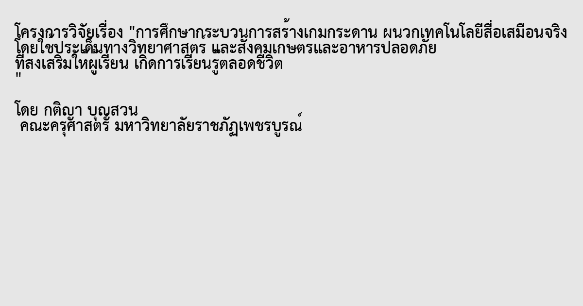 การศึกษากระบวนการสร้างเกมกระดาน ผนวกเทคโนโลยีสื่อเสมือนจริง โดยใช้ประเด็นทางวิทยาศาสตร์ และสังคมเกษตรและอาหารปลอดภัย ที่ส่งเสริมให้ผู้เรียน เกิดการเรียนรู้ตลอดชีวิต