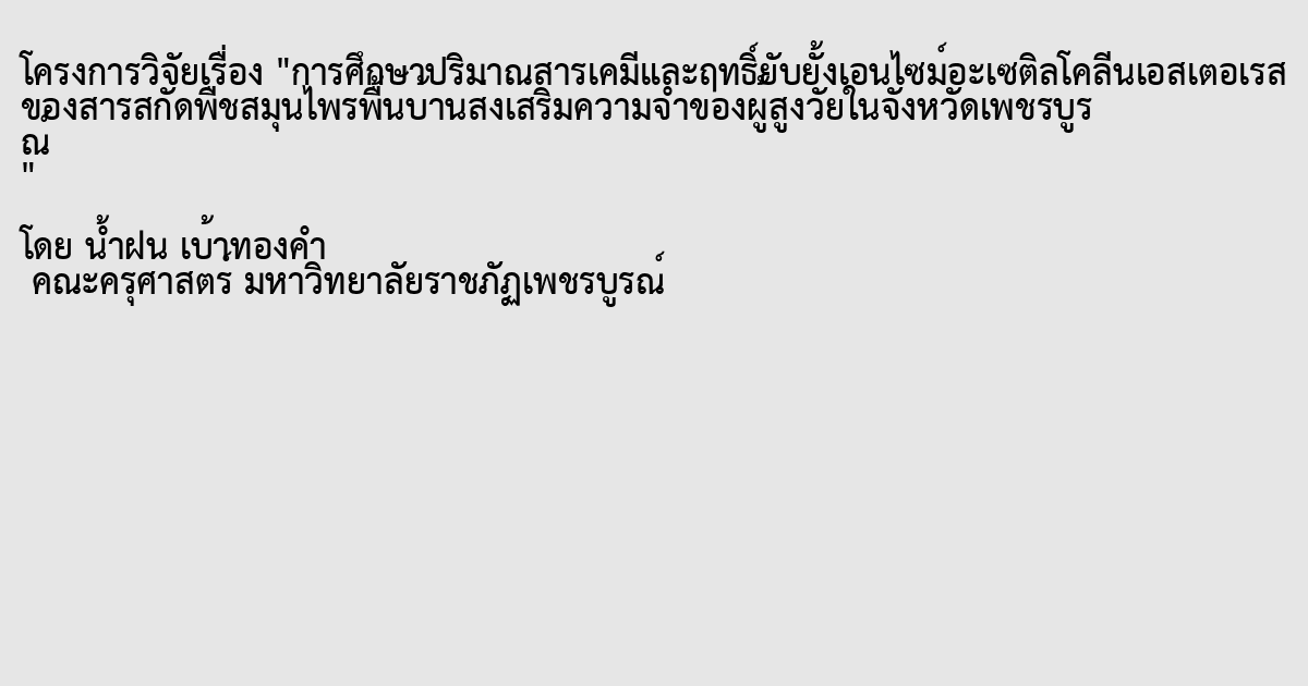 งานวิจัยนี้มีวัตถุประสงค์เพื่อ ) ศึกษาฤทธิ์การยับยั้งอนุมูลอิสระของสารสกัดจากสมุนไพรพื้นบ้าน และ 2) ศึกษาฤทธิ์การยับยั้ง Acetylcholinesterase ของสารสกัดจากสมุนไพรพื้นบ้านจำนวน 5 ชนิด ได้แก่ พริกไทย ผักคราด ขมิ้นชัน กระชายขาว และบัวบก ในตัวทำละลายน้ำที่อัตราส่วน 1:5 อุณหภูมิ 70 °C จากนั้ทดสอบฤทธิ์ต้านอนุมูลอิสระด้วยวิธี DPPH และ ABTS พบว่าสารสกัดของบัวบกมีฤทธิ์การยับยั้งอนุมูลอิสระสูงที่สุดที่ความเข้มข้น 461 μg/mL ของวิธี DPPH และ 188 μg/mL ของวิธี ABTS ผลการทดสอบการยับยั้ง Acetylcholinesterase พบว่าสารสกัดของผักคราดมีฤทธิ์การยับยั้งสูงที่สุดที่ความเข้ามข้น 236 μg/mL
