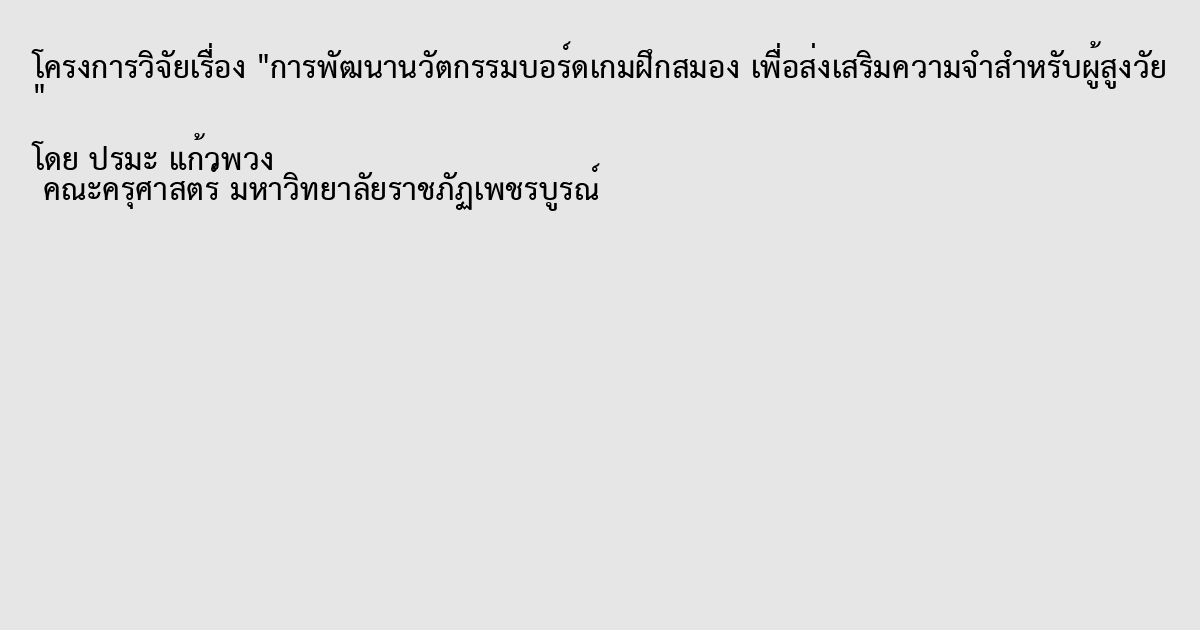 งานวิจัย เรื่อง การพัฒนานวัตกรรมบอร์ดเกมฝึกสมอง เพื่อส่งเสริมความจำสำหรับผู้สูงวัยในจังหวัดเพชรบูรณ์ มีวัตถุประสงค์ 2 ประการได้แก่ 1) เพื่อเปรียบเทียบความจำของผู้สูงวัย ก่อนและหลังการจัดกิจกรรมการเล่นบอร์ดเกมฝึกสมอง เพื่อส่งเสริมความจำสำหรับผู้สูงวัย และ 2) เพื่อศึกษาความพึงพอใจของสูงอายุที่มีต่อการจัดกิจกรรมการเล่นบอร์ดเกมฝึกสมอง เพื่อส่งเสริมความจำสำหรับผู้สูงวัย