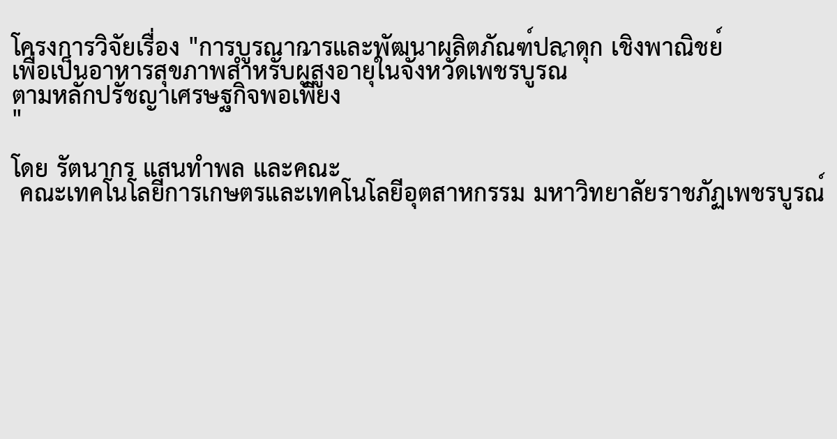 งานวิจัยนี้มีวัตถุประสงค์ เพื่อจัดการขยะอินทรีย์ครัวเรือน โดยใช้หนอนแมลงวันลายและเทคโนโลยีที่เหมาะสม การใช้หนอนแมลงวันลายเสริมอาหารสำเร็จรูปในการเลี้ยงปลาดุก เพื่อลดต้นทุนการผลิต การพัฒนาผลิตภัณฑ์จากปลาดุก เพื่อเป็นอาหารสุขภาพสำหรับผู้สูงอายุ และการเพิ่มมูลค่าจากเศษเหลือทิ้งของปลาดุก สู่การแปรรูปเป็นผลิตภัณฑ์ชนิดใหม่ โดยโครงการวิจัยนี้มีวิธีการดำเนินการวิจัยแบ่งออกเป็น 4 ขั้นตอนตามวัตถุประสงค์ วางแผนการทดลองแบบสุ่มสมบูรณ์ (Completely Randomized Design, CRD) และนำไปประเมินคุณภาพทางประสาทสัมผัสในด้านลักษณะปรากฏ สี กลิ่น รสชาติ เนื้อสัมผัส และการยอมรับโดยรวม ใช้ผู้ทดสอบจำนวน 30 คน ด้วยวิธีการชิมแบบให้คะแนนความชอบ 9 ระดับ (9-Point Hedonic Scale) ผลการวิจัยพบว่า 1) หนอนแมลงวันลายสามารถย่อยขยะอินทรีย์ประเภท เศษผัก ได้มากที่สุด โดยมีน้ำหนักเศษผักเฉลี่ยน้อยที่สุดเมื่อเทียบกับทุกชุดการทดลองต่างๆ ในวันที่ 40, 50, 60 วัน เท่ากับ 2.30±0.10 , 1.93±0.06 และ1.10±0.10 กิโลกรัม ตามลำดับ ซึ่งมีความแตกต่างกันของข้อมูลอย่างมีนัยสําคัญทางสถิติ (P<0.05) 2) การเลี้ยงลูกปลาดุกบิ๊กอุยสามารถเสริมหนอนแมลงวันลายสดได้ถึง 50 เปอร์เซ็นต์ ร่วมกับการให้อาหารเม็ดสำเร็จรูป ซึ่งสามารถลดต้นทุนการผลิตได้ 3) พัฒนาสูตรต้นแบบผลิตภัณฑ์ปลาดุกหยอง สำหรับผู้สูงอายุ ได้ 2 ผลิตภัณฑ์ ได้แก่ ผลิตภัณฑ์ปลาดุกหยองรสดั้งเดิม และรสสาหร่ายผสมงา โดยมีค่า aw เท่ากับ 0.57 และ 0.56 ความชื้นร้อยละ 4.53 และ 4.75 จำนวนจุลินทรีย์ทั้งหมด เท่ากับ 2.5x103 CFU/g และ 3x103 CFU/g และปลาดุกหยองทั้ง 2 ผลิตภัณฑ์ มีปริมาณยีสต์และรา < 25 CFU/g ซึ่งมีปริมาณจุลินทรีย์ทั้งหมด ยีสต์และรา หรืออยู่ในเกณฑ์มาตรฐานกำหนด 4) การเพิ่มมูลค่าจากเศษเหลือทิ้งของปลาดุก สู่การแปรรูปเป็นผลิตภัณฑ์ชนิดใหม่ พบว่าได้ผลิตภัณฑ์น้ำปลาร้าปรุงรสจากเศษเหลือทิ้งจากปลาดุก จำนวน 2 สูตร ผู้บริโภคมีความพึงพอใจในสูตรที่ 1 ในระดับมากที่สุดเท่ากับ 4.65 เมื่อตรวจวิเคราะห์คุณค่าทางโภชนาการต่อ 100 กรัม พบว่ามีค่าพลังงาน 319.95 กิโลแคลอรี่ ไขมัน 1.10 กรัม โปรตีน 10.12 กรัม คาร์โบไฮเดรต 53.41 กรัม และแคลเซียม 305.72 มิลลิกรัม ซึ่งมีค่าอยู่ในเกณฑ์มาตรฐานผลิตภัณฑ์ชุมชนน้ำปลาร้ากำหนด