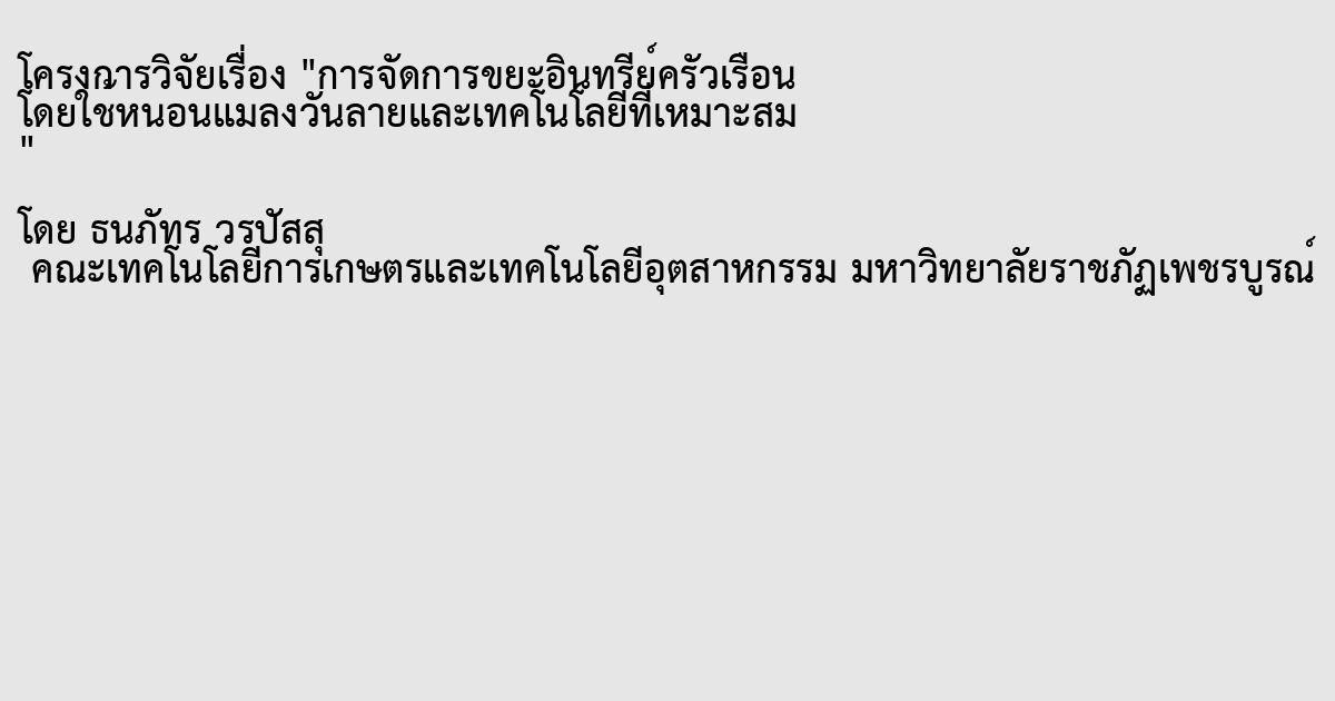 งานวิจัยนี้จึงมีจุดประสงค์ในการจัดการขยะอินทรีย์ครัวเรือน เพื่อพัฒนาเทคโนโลยีที่เหมาะสมต่อการจัดการขยะอินทรีย์ครัวเรือนโดยใช้หนอนแมลงวันลาย และเพื่อพัฒนาผลิตภัณฑ์ปุ๋ยหมักอินทรีย์ครัวเรือนจากหนอนแมลงวันลาย โดยวางแผนการทดลองแบบสุ่มสมบูรณ์ (Completely Randomized Design: CRD ซึ่งปัจจัยของขยะอินทรีย์แต่ละชนิดที่หนอนได้รับที่มีความต่างกัน คือ ชนิดของขยะอินทรีย์ที่ใช้เป็นอาหารสำหรับหนอนแมลงวันลาย (feed type) จำแนกได้เป็น 5 ชนิด คือ อาหารเพาะฟัก (ชุดควบคุม) เศษอาหารจากครัวเรือน เศษผัก เศษผลไม้ และเศษวัสดุทางการเกษตร ผลการวิเคราะห์ข้อมูลพบว่า การคัดแยกขยะอินทรีย์ครัวเรือนมีการย่อยสลายของขยะอินทรีย์ และพบหนอนแมลงวันลายในการย่อยสลายขยะอินทรีย์ทุกชุดการทดลอง โดยผลการวิเคราะห์ข้อมูลน้ำหนักเฉลี่ยของขยะอินทรีย์ครัวเรือนแต่ละชุดการทดลอง สรุปได้ว่า ชุดการทดลองที่ 3 คือ ขยะอินทรีย์ประเภท เศษผัก มีน้ำหนักเฉลี่ยน้อยที่สุดเมื่อเทียบกับทุกชุดการทดลองต่างๆ ในวันที่ 40, 50, 60 วัน เท่ากับ 2.30±0.10 , 1.93±0.06 และ1.10±0.10 กิโลกรัม ตามลำดับ ซึ่งมีความแตกต่างกันของข้อมูลอย่างมีนัยสําคัญทางสถิติ (P<0.05) ส่วนน้ำหนักเฉลี่ยของขยะอินทรีย์ครัวเรือนชุดการทดลองที่ 5 คือ ขยะอินทรีย์ประเภท วัสดุทางการเกษตร มีน้ำหนักเฉลี่ยมากที่สุดเมื่อเทียบกับทุกชุดการทดลองต่างๆ ในวันที่ 40, 50, 60 วัน เท่ากับ 3.13±0.06, 2.77±0.06และ1.97±0.06 กิโลกรัม ตามลำดับ ซึ่งมีความแตกต่างกันของข้อมูลอย่างมีนัยสําคัญทางสถิติ (P<0.05) ส่วนผลการวิเคราะห์น้ำหนักรวมเฉลี่ยหนอนแมลงวันลาย โดยสุ่มเก็บตัวหนอนแมลงวันลายจำนวน 100 ตัว ในช่วงระยะวันดังกล่าว ในการกำจัดขยะอินทรีย์พบว่า น้ำหนักรวมเฉลี่ยหนอนแมลงวันลายวันที่ 40, 50, 60 วัน ในชุดการทดลองที่ 1 มีน้ำหนักรวมเฉลี่ยหนอนแมลงวันลายสูงสุด เท่ากับ 28.00 ±1.00, 31.67±0.58, 24.67±1.15 กรัม ตามลำดับ ส่วนน้ำหนักรวมเฉลี่ยหนอนแมลงวันลายชุดการทดลองที่ 5 คือ ขยะอินทรีย์ประเภท วัสดุทางการเกษตร ในวันที่ 40, 50 และ 60 วัน มีน้ำหนักรวมเฉลี่ยหนอนแมลงวันลายน้อยที่สุด คือ 21.00±1.00, 28.00d±1.00 และ24.00 ±1.00 กรัม ตามลำดับเมื่อเปรียบเทียบทุกชุดการทดลองต่างๆ ซึ่งมีความแตกต่างกันของข้อมูลอย่างมีนัยสําคัญทางสถิติ (P<0.05)