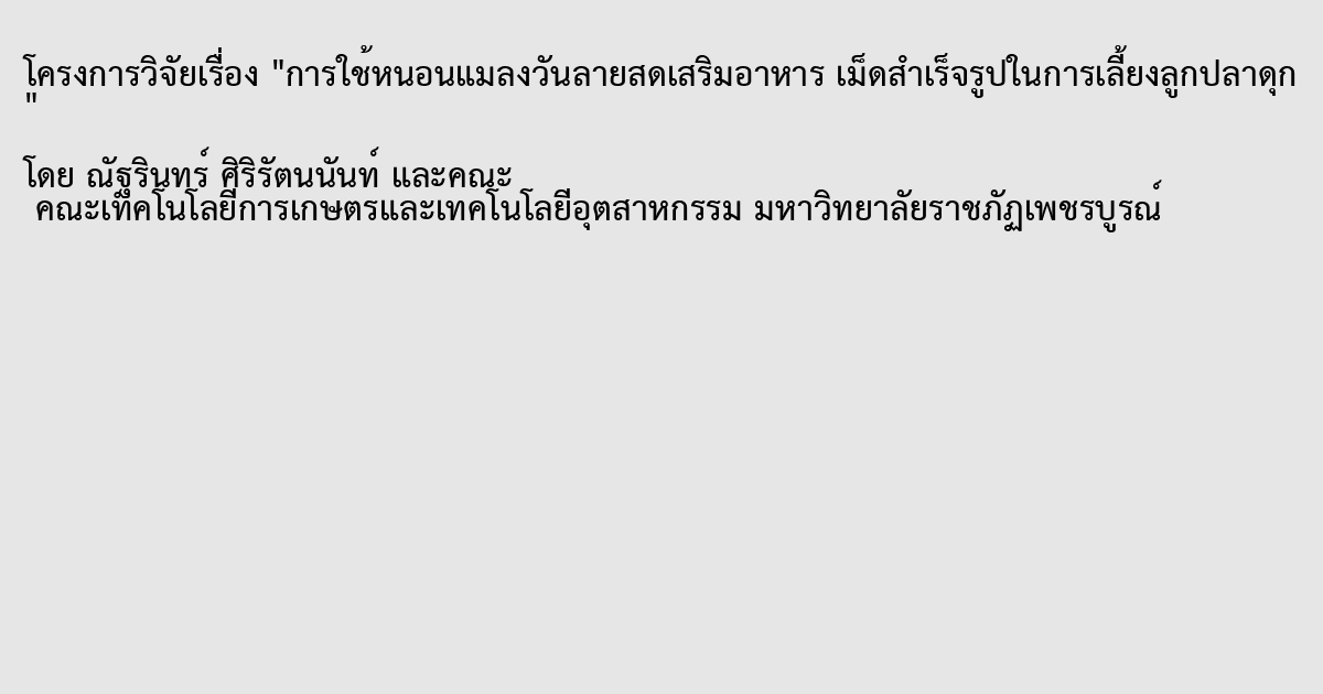 การเสริมหนอนแมลงวันลายสดร่วมกับอาหารเม็ดสำเร็จรูปในการเลี้ยงลูกปลาดุกมีวัตถุประสงค์เพื่อศึกษาสัดส่วนที่เหมาะสมของการใช้หนอนเสริมอาหารเม็ดสำเร็จรูปในการเลี้ยงปลาดุกบิ๊กอุย วางแผนการทดลองแบบสุ่มสมบูรณ์ (Completely Randomized Design, CRD) ประกอบด้วยชุดการทดลองที่ให้อาหารเม็ดสำเร็จรูปร่วมกับหนอนในสัดส่วน 100:0 75:25 50:50 และ 25:75 ของปริมาณอาหารที่ต้องให้ปลาในแต่ละวัน ชุดการทดลองละ 3 ซ้ำ อาหารเม็ดสำเร็จรูปสำหรับปลาดุกมีโปรตีน 30 ถึง 25 เปอร์เซ็นต์ ปลามีอายุเริ่มต้นการทดลองประมาณ 2 เดือนครึ่ง น้ำหนักเริ่มต้นเฉลี่ย 24.24±1.59 กรัม เลี้ยงในกระชังบกผ้าใบเป็นระยะเวลา 60 วัน พบว่า การให้อาหารเม็ดล้วนทำให้ปลามีน้ำหนักที่เพิ่มขึ้นเฉลี่ย อัตราการเจริญเติบโตเฉลี่ยต่อวัน อัตราการเจริญเติบโตจำเพาะ อัตราการเปลี่ยนอาหารเป็นเนื้อ ประสิทธิภาพการใช้อาหารและอัตราการรอดตายดีกว่าชุดการทดลองอื่นๆ แต่มีความแตกต่างกันอย่างไม่มีนัยสำคัญทางสถิติเมื่อเปรียบเทียบกับการเสริมหนอนที่ระดับ 25 และ 50 เปอร์เซ็นต์ อัตราการรอดตายเมื่อสิ้นสุดของทั้ง 4 ชุดการทดลองมีความแตกต่างกันอย่างไม่มีนัยสำคัญทางสถิติซึ่งมีค่าอยู่ระหว่าง 91-81 เปอร์เซ็นต์ ดังนั้นการเลี้ยงลูกปลาดุกบิ๊กอุยสามารถเสริมหนอนแมลงวันลายสดได้ถึง 50 เปอร์เซ็นต์ ร่วมกับการให้อาหารเม็ดสำเร็จรูป อย่างไรก็ตามการเสริมหนอนแมลงวันลายสดไม่ควรทำในระยะนานถึง 60 วัน เนื่องจากเมื่อสิ้นสุดการทดลอง พบว่า ปลาดุกในชุดการทดลองที่ให้หนอนแมลงวันลายสดมีอาการตัวเหลืองแต่ที่ระยะเวลา 30 วัน ของการทดลองยังไม่พบอาการดังกล่าว