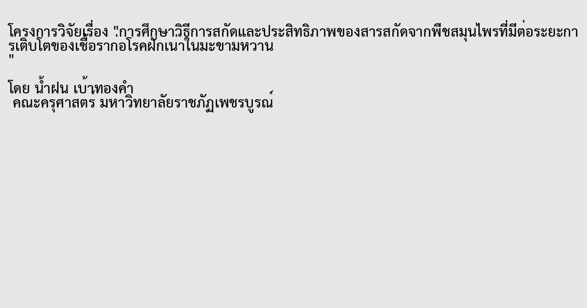 เชื้อราก่อโรคเน่าในมะขามหวานเป็นปัญหาที่มีมานานของจังหวัดเพชรบูรณ์ ดังนั้นงานวิจัยนี้เป็นแนวทางหนึ่งของการหาวิธีแก้ไขปัญหาโรคเชื้อราในมะขาม โดยนำพืชที่มีรายงานผลการยับยั้งการเจริญเติบโตของเชื้อรา เช่น เปลือกมังคุด ผลหมาก และก้านอบเชย พบว่าสารสกัดจากผลหมากความเข้มข้นร้อยละ 2 ที่ปริมาตร 20 มิลลิลิตร ในอาหารเลี้ยงเชื้อ PDA ปริมาตร 70 มิลลิลิตร มีประสิทธิภาพการยับยั้งการเจริญเติบโตของเชื้อราก่อโรคเน่าของมะขามหวานได้นานที่สุดที่ 72 ชั่วโมง โดยมีวิธีการเตรียมสารสกัด ดังต่อไปนี้นำตัวทำละลายเมทานอลที่อัตราส่วนพืชต่อตัวทำละลาย 1:20 (w/v) แช่ที่อุณหภูมิห้องเป็นเวลา 7 วัน นำมากรองแล้วระเหยตัวทำละลาย เมทานอลด้วยเครื่องระเหยสุญญากาศ นำสารสกัดที่ได้มาละลายด้วยตัวทำละลายน้ำที่ความเข้าข้นของสารสกัดที่ร้อยละ 2 จากนั้นนำไปผสมกับอาหารเลี้ยงเชื้อ PDA ที่ปริมาตร 10, 20, 30 และ 40 มิลลิตร เมื่ออาหารเลี้ยงเชื้อแข็งตัวแล้วให้นำเชื้อราที่ความเข้าข้น 10-7 streak plate ให้ทั่วอาหารเลี้ยงเชื้อ จากนั้นนำไปเข้าตู้บ่มเชื้อที่อุณหภูมิ 38 องศาเซลเซียส เป็นเวลา 24, 48 และ 72 ชั่วโมง