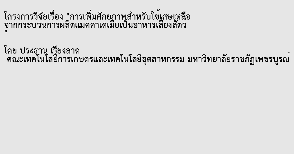 การเพิ่มศักยภาพสำหรับใช้เศษเหลือจากกระบวนการผลิตแมคคาเดเมียเป็นอาหารเลี้ยงสัตว์ มีวัตถุประสงค์เพื่อศึกษาสัดส่วนแมคคาเดเมียเหลือทิ้งที่เหมาะสมสำหรับใช้ประกอบอาหารข้นที่จะส่งผลต่อสมรรถนะการเจริญเติบโตของโคเนื้อ โดยโคเนื้อพันธุ์ลูกผสมสายเลือดบราห์มัน (Brahman) น้ำหนักตัว 171±5 กิโลกรัม อายุประมาณ 1 ปี 6 เดือน จำนวน 16 ตัว สุ่มสัตว์เข้าทดลองตามแผนการทดลองแบบสุ่มสมบูรณ์ ทำ 4 ซ้ำ (Replication) ประกอบด้วยอาหารข้นผสม 4 สูตร (treatment) ดังนี้ สูตรที่ 1 อาหารข้นผสมแมคคาเดเมียเหลือทิ้ง 0 เปอร์เซ็นต์ สูตรที่ 2 อาหารข้นผสมแมคคาเดเมียเหลือทิ้ง 10 เปอร์เซ็นต์ สูตรที่ 3 อาหารข้นผสมแมคคาเดเมียเหลือทิ้ง 20 เปอร์เซ็นต์ และสูตรที่ 4 อาหารข้นผสมแมคคาเดเมียเหลือทิ้ง 30 เปอร์เซ็นต์ โดยใช้ระยะเวลาเลี้ยง 90 วัน พบว่าโคเนื้อมีน้ำหนักเฉลี่ยอยู่ระหว่าง 210.33 – 218.83 กิโลกรัม/ตัว และอัตราการเจริญเติบโต พบว่า อยู่ระหว่าง 0.42 - 0.47 กิโลกรัม/ตัว/วัน ตามลำดับ แต่ไม่มีมีความแตกต่างกันทางสถิติ (P>0.05)
