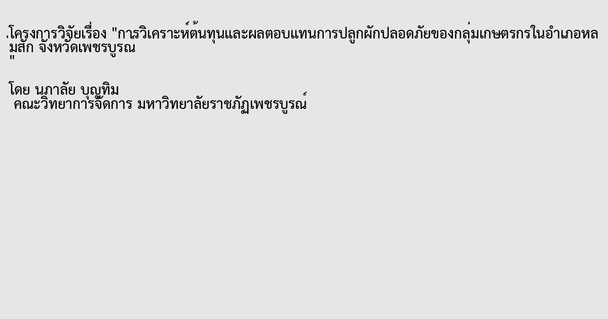 งานวิจัยนี้มีวัตถุประสงค์เพื่อศึกษาการปลูกผักปลอดภัย ศึกษาต้นทุน รายได้ และการวิเคราะห์ต้นทุนและผลตอบแทนจากการปลูกผักปลอดภัย โดยใช้แบบสัมภาษณ์ในเก็บรวบรวมข้อมูลจากเกษตรกรผู้ปลูกผักปลอดภัยในกลุ่มแปลงใหญ่ อ.หล่มสัก จ.เพชรบูรณ์ ที่ได้รับการรับรองมาตรฐาน GAP สำหรับการวิเคราะห์ข้อมูลโดยใช้สถิติเชิงพรรณนา
