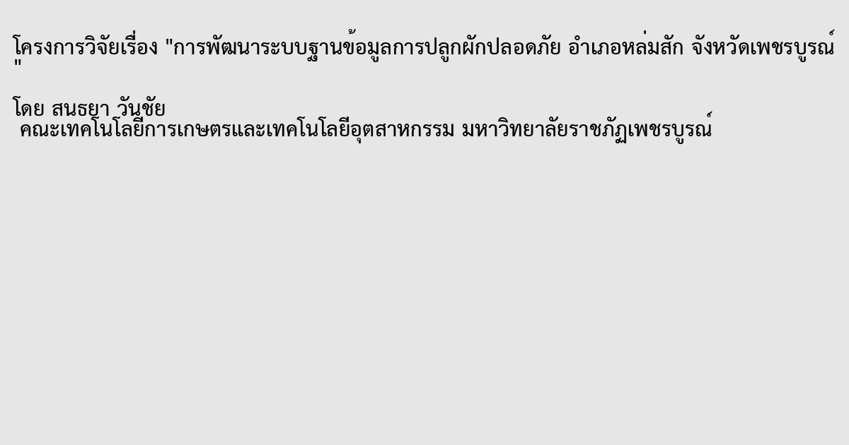รายงานการวิจัยเรื่องการพัฒนาระบบฐานข้อมูลการปลูกผักปลอดภัยอำเภอหล่มสัก จังหวัดเพชรบูรณ์ มีวัตถุประสงค์ เพื่อรวบรวมข้อมูลการปลูกผักปลอดภัยและพัฒนาระบบฐานข้อมูลการปลูกผักปลอดภัยอำเภอหล่มสัก จังหวัดเพชรบูรณ์ เครื่องมือที่ใช้ในการวิจัยได้แก่แบบสัมภาษณ์และการพัฒนาโปรแกรมระบบฐานข้อมูลการปลูกผักปลอดภัย การเก็บข้อมูลจากกลุ่มตัวอย่างได้แก่ เกษตรกร เก็บข้อมูลพื้นฐานการปลูกผักปลอดภัย และ นักเรียนนักศึกษา อาจารย์ บุคลากรทางการศึกษา เกษตรกร และหน่วยงานด้านการเกษตร ประเมินความพึงพอใจผู้ใช้ระบบฐานข้อมูลผักปลอดภัย