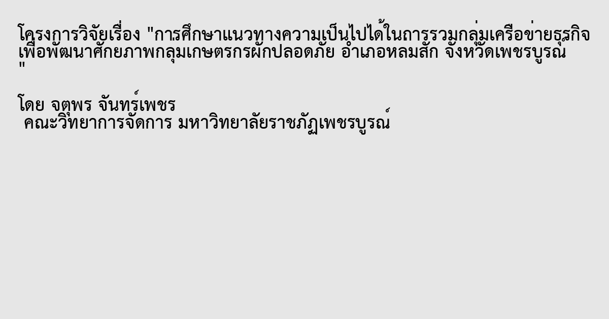 การศึกษาในครั้งนี้มีวัตถุประสงค์ 1) เพื่อศึกษาบริบทชุมชน และบริบทเฉพาะของกลุ่มผักปลอดภัย อำเภอหล่มสัก จังหวัดเพชรบูรณ์ 2) เพื่อพัฒนาศักยภาพของกลุ่มเกษตรกรผักปลอดภัย อำเภอหล่มสัก จังหวัดเพชรบูรณ์ 3) เพื่อศึกษาแนวทางความเป็นไปได้ในการรวมกลุ่มเครือข่ายธุรกิจ โดยการศึกษาและเก็บรวบรวมข้อมูลโดยใช้แบบสัมภาษณ์เชิงลึกจากเกษตรกรผักปลอดภัย ในอำเภอหล่มสัก จำนวน 4 กลุ่ม โดยใช้วิธีการวิเคราะห์จุดแข็ง จุดอ่อน โอกาส และ อุปสรรค (SWOT Analysis) และการวิเคราะห์ความสามารถในการแข่งขันโดยใช้แบบจำลองระบบเพชร (Diamond Model)