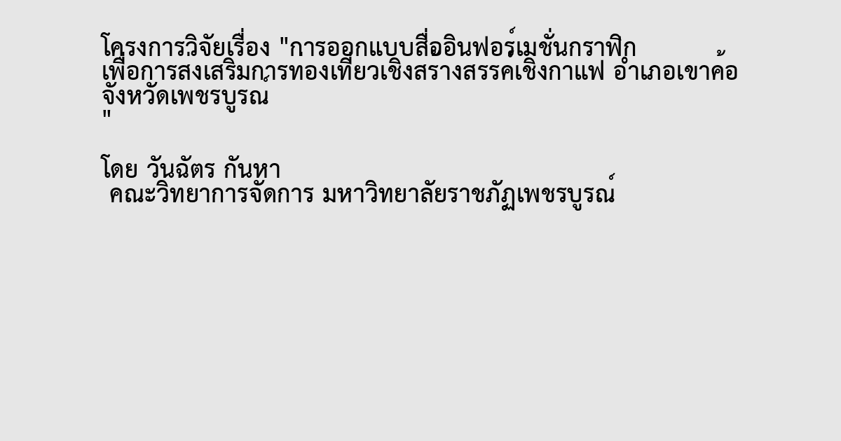 For design of infographic media to promote creative coffee tourism, there are contents to educate creative coffee tourism and creative coffee tourism activities presented 3 sets consisting of Series 1 Knowledge about coffee; Series 2 Creative coffee tourism; and Series 3 Tourism activities. "From a tree to a taste : Khoakho’s Aribica". From the assessment of the quality of infographic media for creative coffee tourism publicity, it was found that the overall quality assessment result was at a good level at 4.10. In this way, meaning through infographics can also convey knowledge. and create a memory appropriate to the current situation.