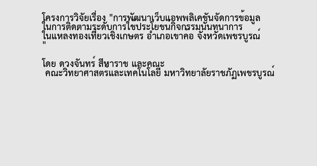งานวิจัยนี้มีวัตถุประสงค์ 1) เพื่อการพัฒนาเว็บแอพพลิเคชันจัดการข้อมูลในการติดตามระดับการใช้ประโยชน์กิจกรรมนันทนาการในแหล่งท่องเที่ยวเชิงเกษตร อำเภอเขาค้อ จังหวัดเพชรบูรณ์ 2) เพื่อวัดความพึงพอใจผู้ใช้งานเว็บแอพพลิเคชันจัดการข้อมูลในการติดตามระดับการใช้ประโยชน์กิจกรรมนันทนาการ และ 3) เพื่อเก็บรวบรวมข้อมูลการใช้ประโยชน์กิจกรรมนันทนาการการวิจัยนี้เป็นการวิจัยและพัฒนา โดยมีกระบวนการวิจัยแบ่งเป็น 4 ขั้นตอน ได้แก่ การศึกษารวบรวมข้อมูลแหล่งท่องเที่ยวเชิงเกษตร การออกแบบและพัฒนาระบบ การประเมินประสิทธิภาพระบบ และการประเมินความพึงพอใจผู้ใช้ เครื่องมือการวิจัย ได้แก่ ระบบเช็คอินด้วยรหัส QR และ GPS และระบบบันทึกโปรไฟล์และพฤติกรรมของนักท่องเที่ยวโดยเว็บแอปพลิเคชัน อัลกอริทึมการเรียนรู้ของเครื่อง ได้แก่ นิวรอลเนตเวิร์ต เอสวีเอ็ม เคเนียเรสเนสเบอร์ และแผนผังต้นไม้เพื่อการตัดสินใจ การจัดกลุ่มพฤติกรรมการท่องเที่ยวของนักท่องเที่ยวด้วยอัลกอริทึมเคมีน การวิเคราะห์ความรู้สึกตามเทคนิคการการประมวลผลภาษาธรรมชาติ และวิธีสหสัมพันธ์สเปียร์แมน ภาษาที่ใช้พัฒนาโปรแกรม ได้แก่ ภาษาไพธอน พีเอชพี และจาวาสคริปต์ ผลการวิจัยพบว่า เว็บแอปพลิเคชันประกอบด้วย 5 ฟังก์ชัน ได้แก่ การจัดการข้อมูลสถานที่ท่องเที่ยว จัดการพื้นที่และประเภทกิจกรรมนันทนาการ การจัดการข้อมูลผู้จัดการ/ดูแลสถานที่ท่องเที่ยว และการ เชคอินของนักท่องเที่ยว และรายงานสถิติการเชคอินในสถานที่ท่องเที่ยวแต่ละแห่ง ระบบเช็คอินและนับที่ใช้ GPS กับ WKNN สามารถระบุจุดเช็คอินได้อย่างแม่นยำถึง 84.6% ประสิทธิภาพของระบบในการทำนายจำนวนนักท่องเที่ยวในจุดท่องเที่ยวที่มีการถดถอยพหุคูณแสดงความถูกต้อง 71.2% การจำแนกข้อเสนอแนะที่จะเยี่ยมชม ณ เวลาใด ๆ โดย NN แสดงให้เห็นความถูกต้องสูงสุด 90.5% จัดกลุ่มนักท่องเที่ยวตามโปรไฟล์และพฤติกรรมของนักท่องเที่ยวด้วย K-mean ที่ k=3 ของ 77.23 % และสภาพความคิดเห็นและความคิดเห็นของนักท่องเที่ยวสัมพันธ์กับการมาเยี่ยมซ้ำและการบอกต่ออย่างมีนัยสำคัญที่ .05