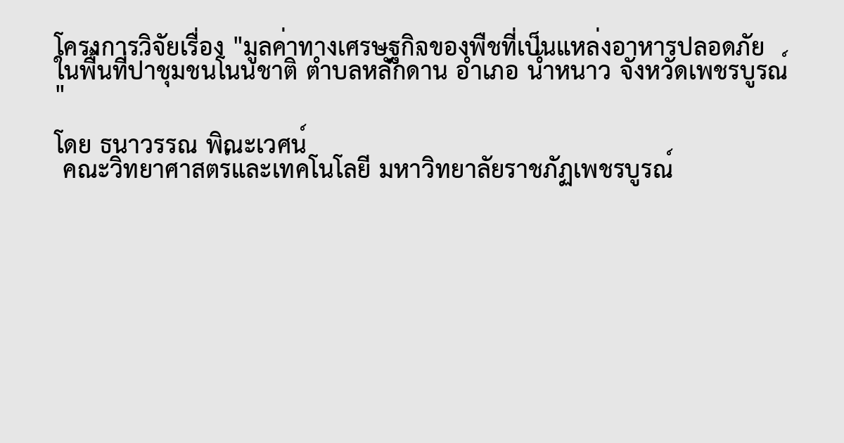 การวิจัยครั้งนี้มีวัตถุประสงค์เพื่อประเมินมูลค่าทางเศรษฐกิจของพืชที่เป็นแหล่งอาหารปลอดภัย ในพื้นที่ป่าชุมชนโนนชาติ ตำบลหลักด่าน อำเภอน้ำหนาว จังหวัดเพชรบูรณ์ เพื่อสะท้อนมูลค่าที่ชุมชนได้ใช้ประโยชน์โดยตรงจากพืชอาหารโดยการนำมาบริโภค และจำหน่ายเป็นรายได้เสริมภายในครัวเรือน ซึ่งงานวิจัยนี้รวบรวมข้อมูลการใช้ประโยชน์และประเมินมูลค่าทางเศรษฐกิจของพืชอาหารที่ชุมชนเก็บหา โดยใช้การสัมภาษณ์กลุ่มกรรมการดูแลป่าชุมชน กลุ่มผู้ใช้ประโยชน์ และจากข้อมูลทุติยภูมิที่ได้มีการรวบรวมไว้ก่อนหน้า ร่วมกับวิธีการวางแปลงสำรวจความหลากหลายของพืชอาหาร ผลการศึกษา พบว่า พืชที่เป็นอาหารของชุมชน ทั้งหมด 19 ชนิด โดยมูลค่ารวมของการเก็บหาพืชอาหารในป่าชุมชนโนนชาติ มีมูลค่าทางเศรษฐกิจโดยรวมจากทรัพยากรในระบบนิเวศป่าชุมชนโนนชาติเฉพาะพืชที่นำมาเป็นอาหาร เท่ากับ 4,319,700 บาทต่อปี คิดเป็นมูลค่าเฉลี่ยต่อครัวเรือน 32,725 บาท/ปี