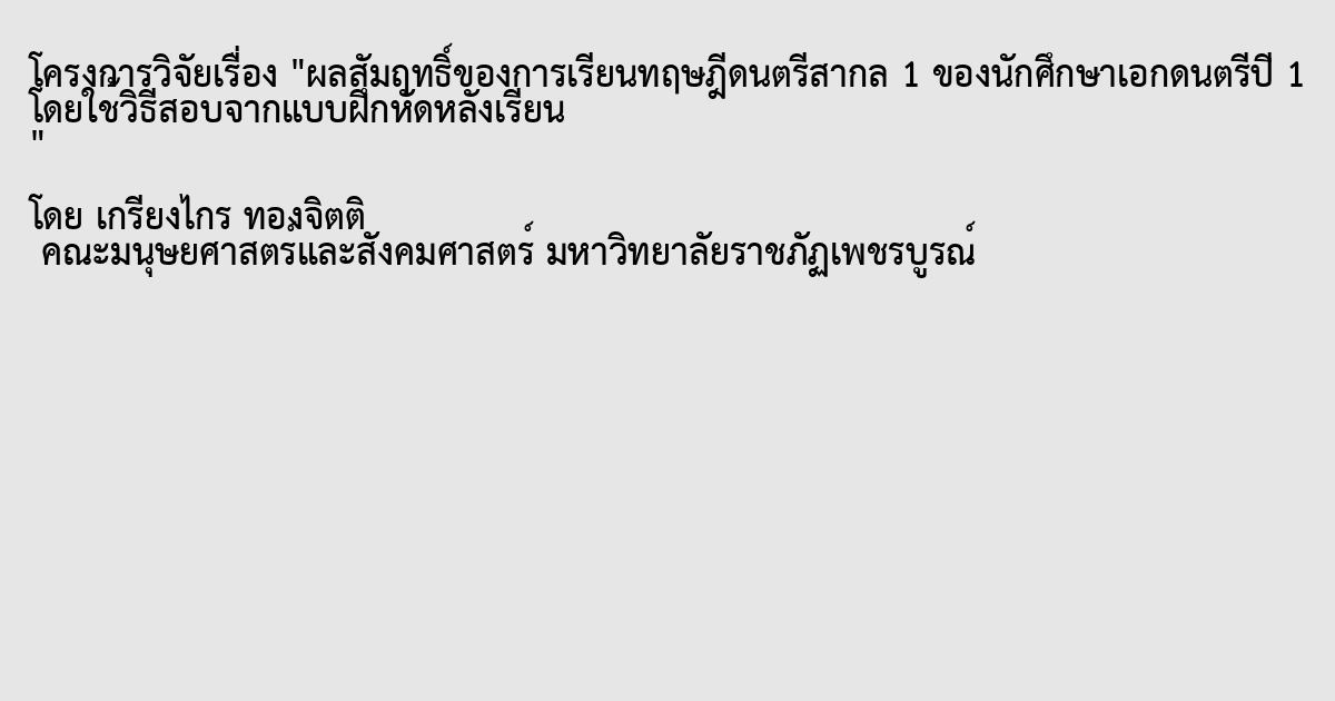 ผลสัมฤทธิ์ของการเรียนทฤษฎีดนตรีสากล 1 ของนักศึกษาเอกดนตรีปี 1 โดยใช้วิธีสอบจากแบบฝึกหัดหลังเรียน