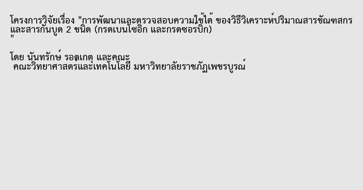 การพัฒนาและตรวจสอบความใช้ได้ ของวิธีวิเคราะห์ปริมาณสารขัณฑสกร และสารกันบูด 2 ชนิด (กรดเบนโซอิก และกรดซอร์บิก)