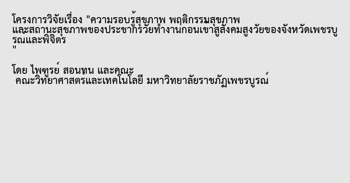 เป็นการศึกษาแบบเชิงวิเคราะห์แบบภาคตัดขวาง (Cross-sectional analytical study) มีวัตถุประสงค์เพื่อวัดระดับความรอบรู้ทางสุขภาพและพฤติกรรมสุขภาพ และทดสอบความสัมพันธ์ระหว่างปัจจัยต่าง ๆ กับความรอบรู้ทางสุขภาพและพฤติกรรมสุขภาพ เครื่องมือเป็นแบบสอบถามเก็บรวบรวมข้อมูลจากกลุ่มตัวอย่างอายุ 30-59 ปี ในพื้นที่ของจังหวัดเพชรบูรณ์และพิจิตร 2,002 คนใช้สถิติ Multiple binary logistic regression เพื่อทดสอบความสัมพันธ์