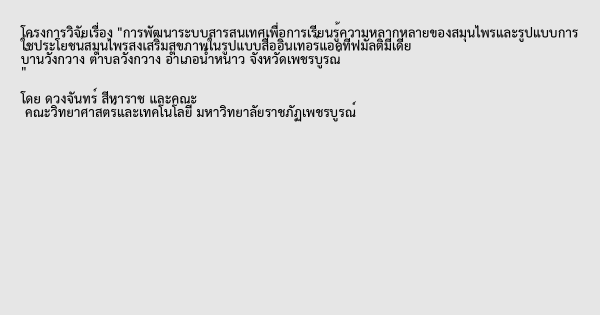 งานวิจัยนี้มีวัตถุประสงค์ 1) เพื่อสร้างองค์ความรู้การนำสมุนไพรไปใช้ประโยชน์ของชุมขนบ้านวังกวาง ตำบลวังกวาง อำเภอน้ำหนาว จังหวัดเพชรบูรณ์ และ 2) เพื่อพัฒนาระบบสารสนเทศเพื่อการเรียนรู้ความหลากหลายของสมุนไพรและรูปแบบการใช้ประโยชน์สมุนไพรส่งเสริมสุขภาพในรูปแบบสื่ออินเทอร์แอคทีฟมัลติมีเดีย การวิจัยนี้เป็นการวิจัยและพัฒนา โดยมีกระบวนการวิจัยแบ่งเป็น 4 ขั้นตอน ได้แก่ การศึกษารวบรวมข้อมูลสมุนไพร การออกแบบและพัฒนาระบบ การประเมินประสิทธิภาพระบบ และการประเมินความพึงพอใจผู้ใช้ เครื่องมือการวิจัย ได้แก่ เว็บไซต์นำเสนอองค์ความรู้สมุนไพรไทย จำนวน 100 แหล่ง ทำการวัดประสิทธิภาพในการสกัดความรู้เชิงความหมาย และทำนายเพื่อจำแนกชื่อสมุนไพร ด้วยอัลกอริทึมการเรียนรู้ของเครื่อง ได้แก่ นิวรอลเนตเวิร์ต เอสวีเอ็ม เคเนียเรสเนสเบอร์ และแผนผังต้นไม้เพื่อการตัดสินใจ การสร้างออนโทโลยรด้วยโปรแกรมโปรทีเจ ภาษาที่ใช้พัฒนาโปรแกรม ได้แก่ ภาษาไพธอน พีเอชพี และจาวาสคริปต์ ผลการวิจัยพบว่า ระบบสารสนเทศประกอบด้วย 4 ฟังก์ชัน ได้แก่ การจัดการข้อมูลสมุนไพร การจัดการข้อมูลปราชญ์ชาวบ้าน/ผู้เชี่ยวชาญ การสืบค้นข้อมูลสมุนไพร และรายงานสถิติการสืบค้นข้อมูลสมุนไพร ออนโทโลยีสมุนไพรไทย แบ่งเป็น 2 ชั้นความรู้ และมีโหนดความรู้จำนวนทั้งหมด 8 โหนด กระบวนการเรียนรู้ของเครื่องบนเหมืองความรู้เชิงความหมายสมุนไพรไทย ประกอบด้วย 4 ส่วน ได้แก่ การประมวลผลเชิงความหมาย การสกัดเหมืองความรู้ การสร้างชุดข้อมูลสมุนไพร และ การทำนายผลลัพธ์ด้วยการเรียนรู้ของเครื่อง ผลการประเมินประสิทธิภาพในการค้นคืนความรู้เชิงความหมายสมุนไพรไทยโดยใช้ออนโทโลยี และกฎSWRL ได้ค่า F-measure เท่ากับ 87.9% และประสิทธิภาพในการทำนาย เพื่อจำแนกคลาสคำตอบสมุนไพร ด้วยอัลกอริทึม NN ได้ค่าความถูกต้องสูงที่สุด เท่ากับ 90.0% และผู้ใช้มีความพึงพอใจต่อระบบในภาพรวมอยู่ในระดับมาก