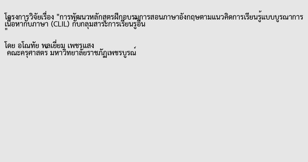 การพัฒนาหลักสูตรฝึกอบรมการสอนภาษาอังกฤษตามแนวคิดการเรียนรู้แบบบูรณาการเนื้อหากับภาษา (CLIL) กับกลุ่มสาระการเรียนรู้อื่น