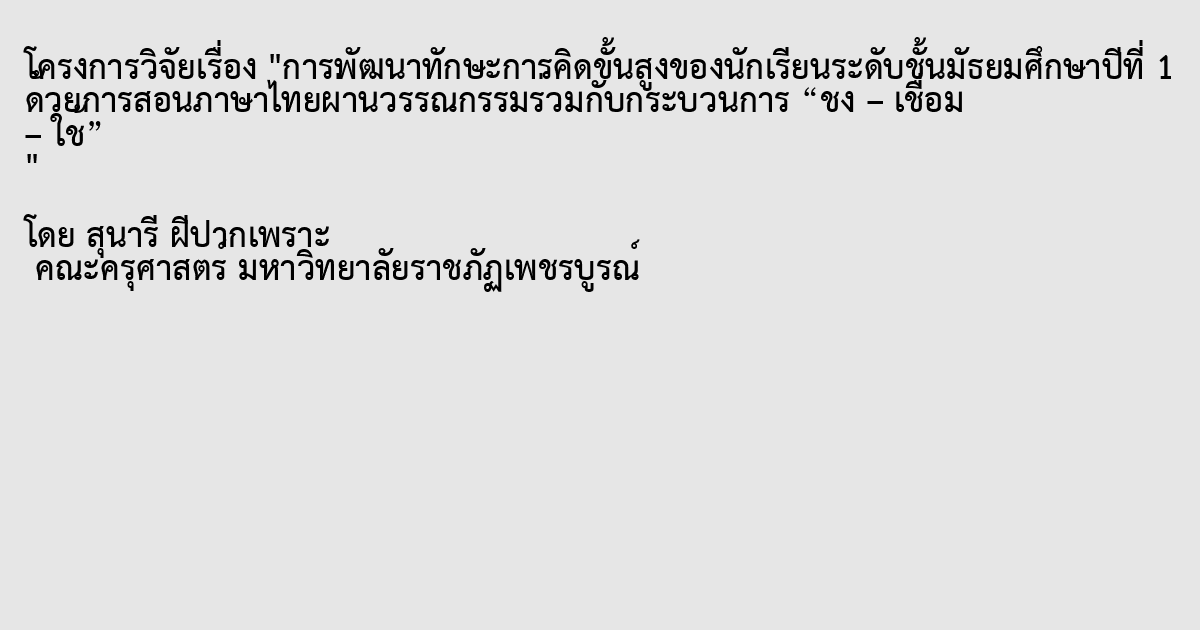 การพัฒนาทักษะการคิดขั้นสูงของนักเรียนระดับชั้นมัธยมศึกษาปีที่ 1 ด้วยการสอนภาษาไทยผ่านวรรณกรรมร่วมกับกระบวนการ “ชง – เชื่อม – ใช้”