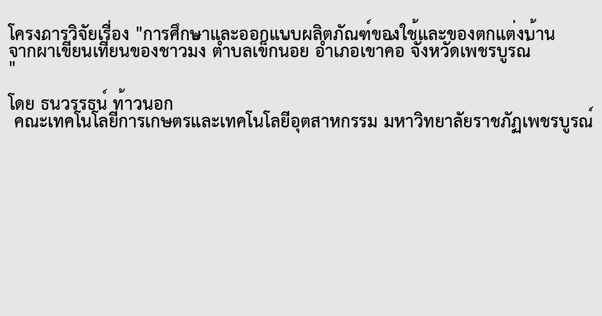 การศึกษาและออกแบบผลิตภัณฑ์ของใช้และของตกแต่งบ้าน จากผ้าเขียนเทียนของชาวม้ง ตำบลเข็กน้อย อำเภอเขาค้อ จังหวัดเพชรบูรณ์