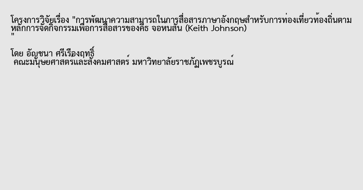 การพัฒนาความสามารถในการสื่อสารภาษาอังกฤษสำหรับการท่องเที่ยวท้องถิ่นตามหลักการจัดกิจกรรมเพื่อการสื่อสารของคีธ จอห์นสัน (Keith Johnson)