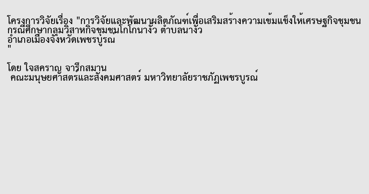 การวิจัยและพัฒนาผลิตภัณฑ์เพื่อเสริมสร้างความเข้มแข็งให้เศรษฐกิจชุมชน กรณีศึกษากลุ่มวิสาหกิจชุมชนโกโก้นางั่ว ตำบลนางั่ว อำเภอเมืองจังหวัดเพชรบูรณ์