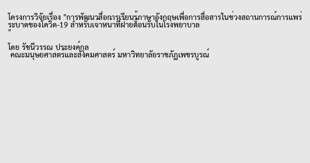 การพัฒนาสื่อการเรียนรู้ภาษาอังกฤษเพื่อการสื่อสารในช่วงสถานการณ์การแพร่ระบาดของโควิด-19 สำหรับเจ้าหน้าที่ฝ่ายต้อนรับในโรงพยาบาล